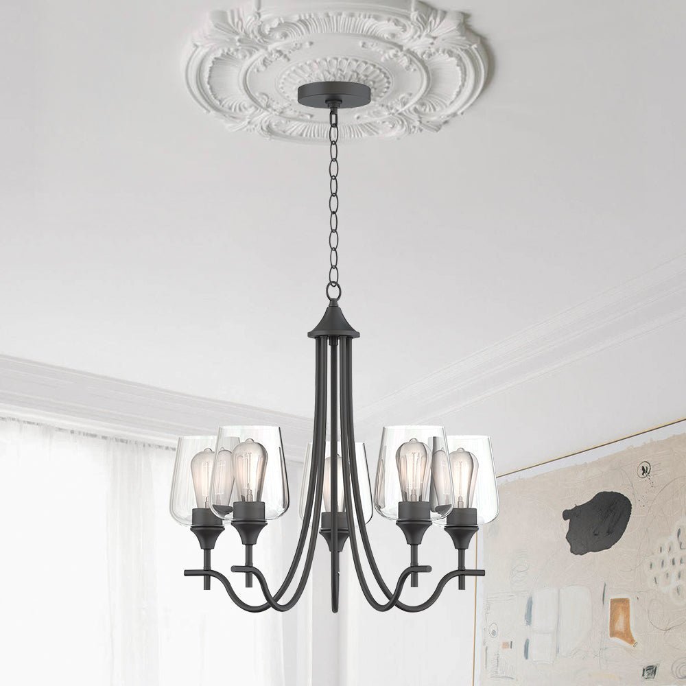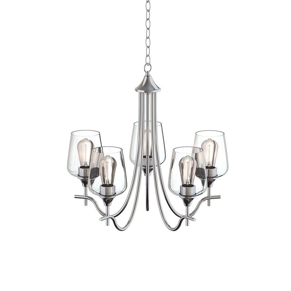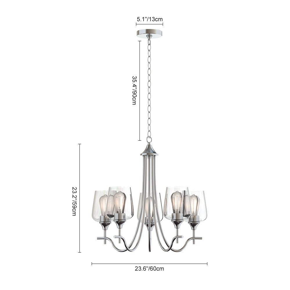 Exquisite and delicately crafted. this 5-light empire chandelier is the epitome of sophisticated luxury. This chandelier features five metal curved arms stretching upward to support five wine-glass-shaped shades made of clear glass. creating a candle-style silhouette. Paired with a sleek black and nickel finish. this chandelier ensures a captivating ambiance for an entryway. bedroom. dining room. living room. or kitchen island setting.