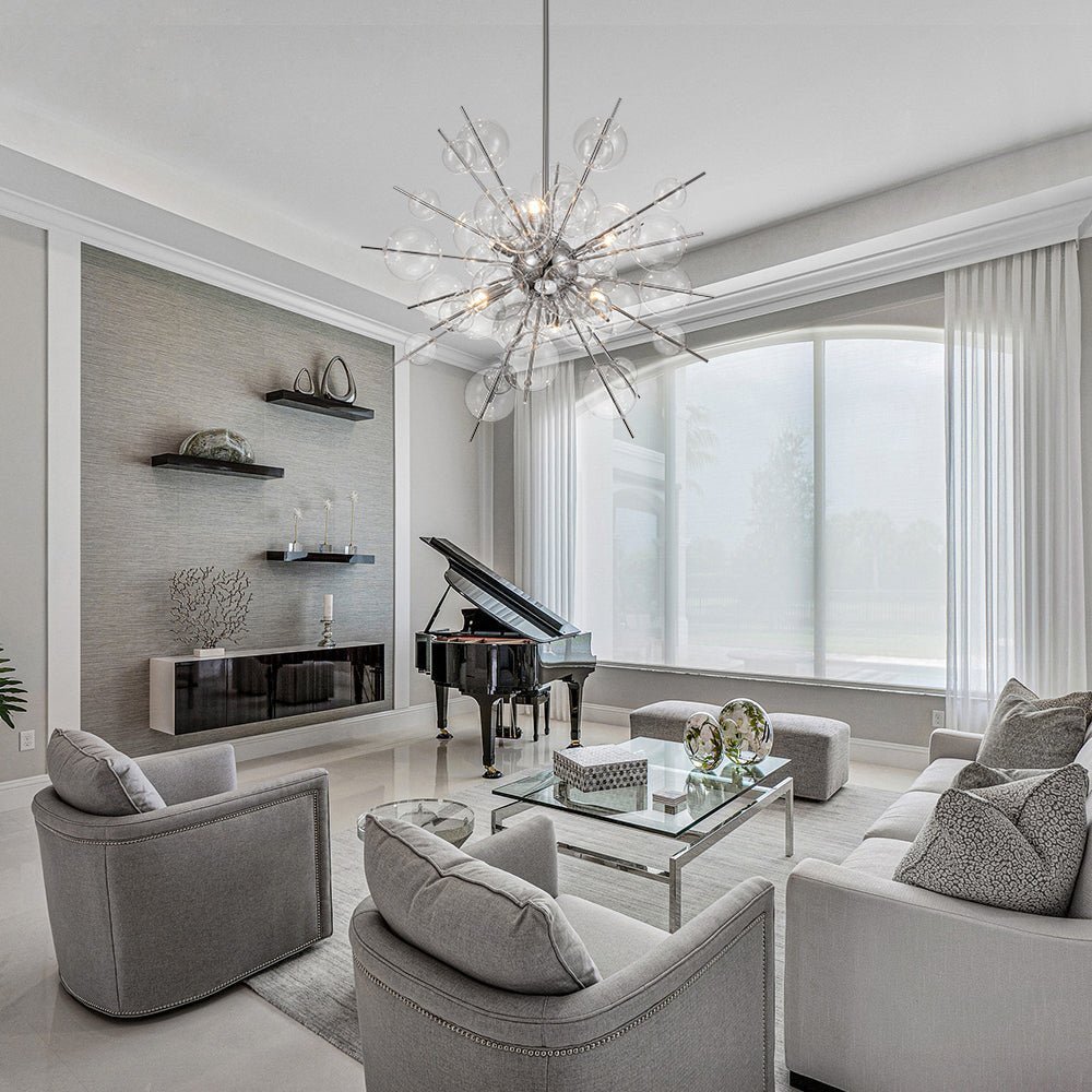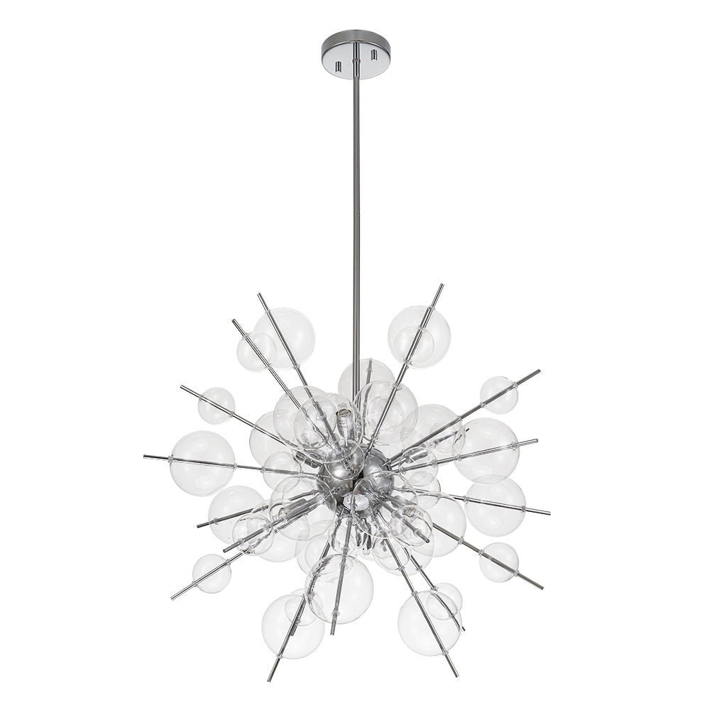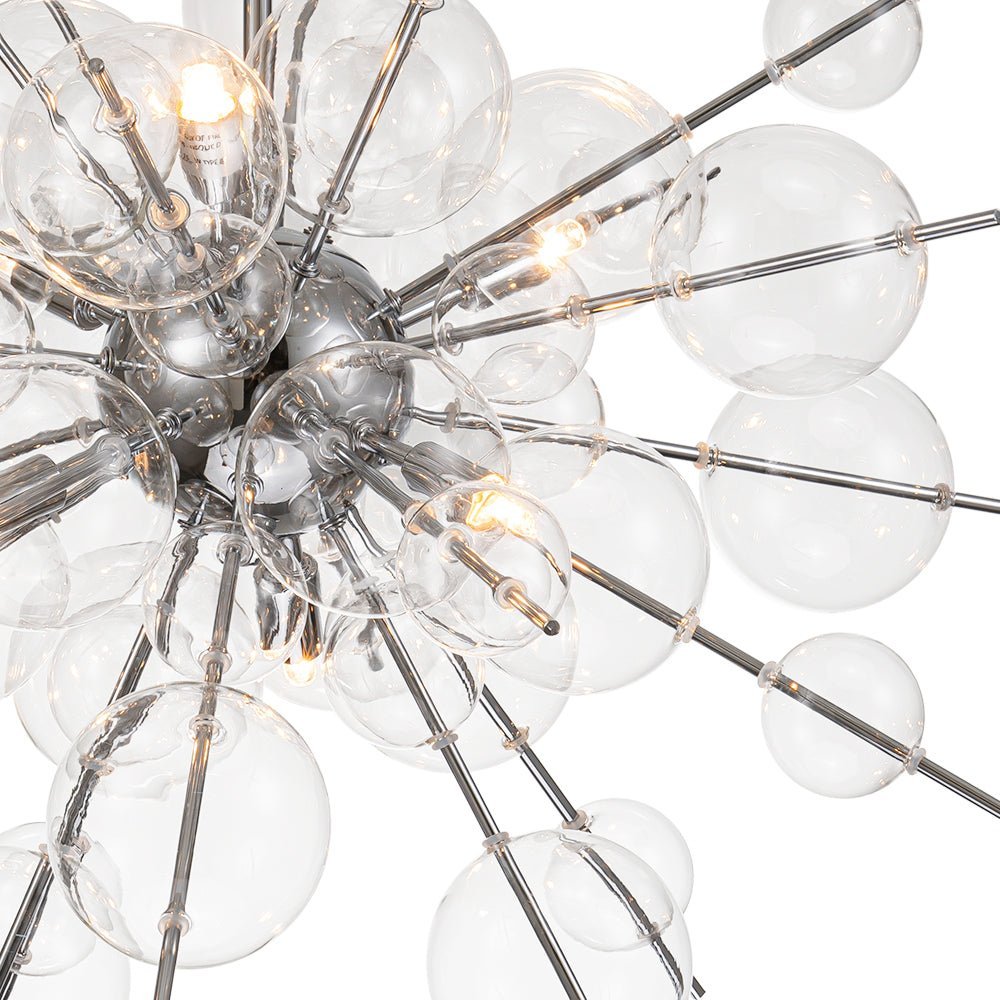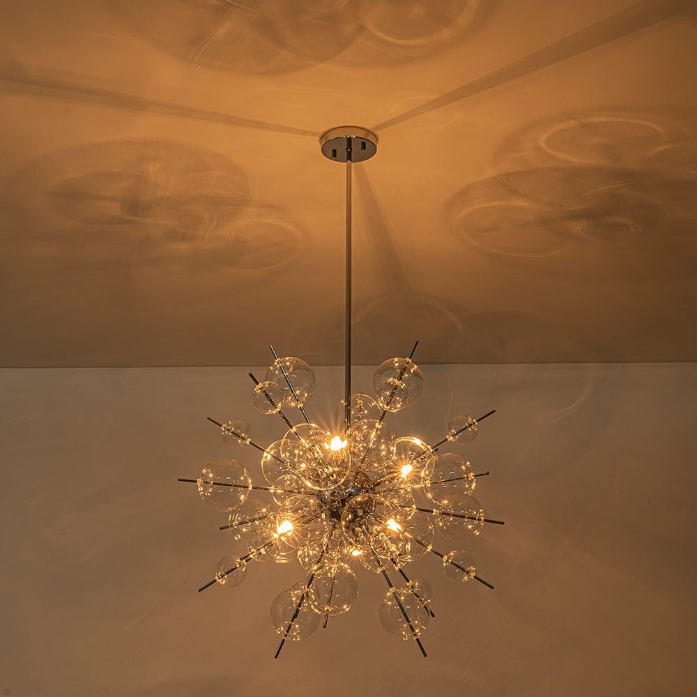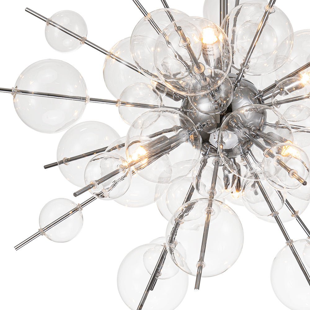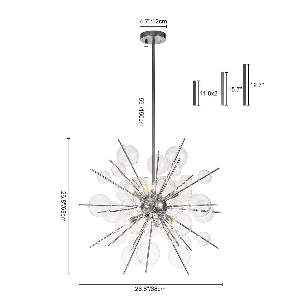 Our 6-light chandelier skillfully blends the sputnik style with bubble elegance. capturing the essence of modern romance and subtle luxury. Finished in polished chrome. this sputnik light fixture showcases a timeless sunburst design adorned with transparent glass balls of varying sizes. reminiscent of delicate strings of crystal-like candied haws. Six G9 bulbs (not included) are evenly positioned on the central sphere. casting a warm and inviting glow. Perfect for dining rooms. living rooms. entryways. kitchen islands. bedrooms. or bathrooms. this glass globe bubble chandelier brings eclectic charm and a serene ambiance to rejuvenate your space.