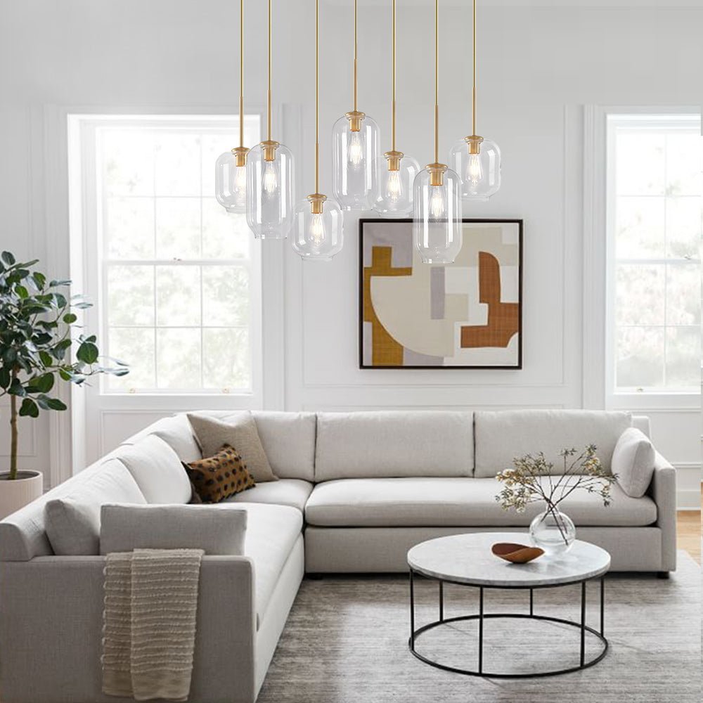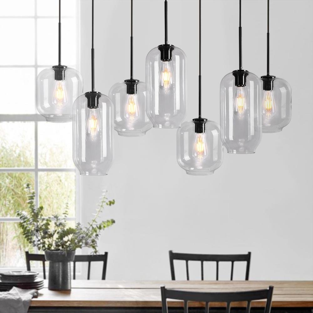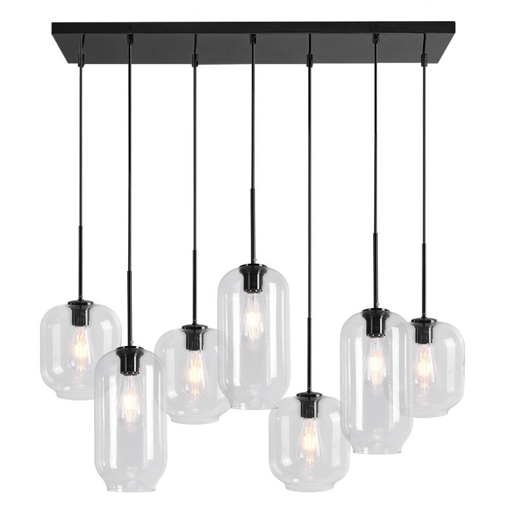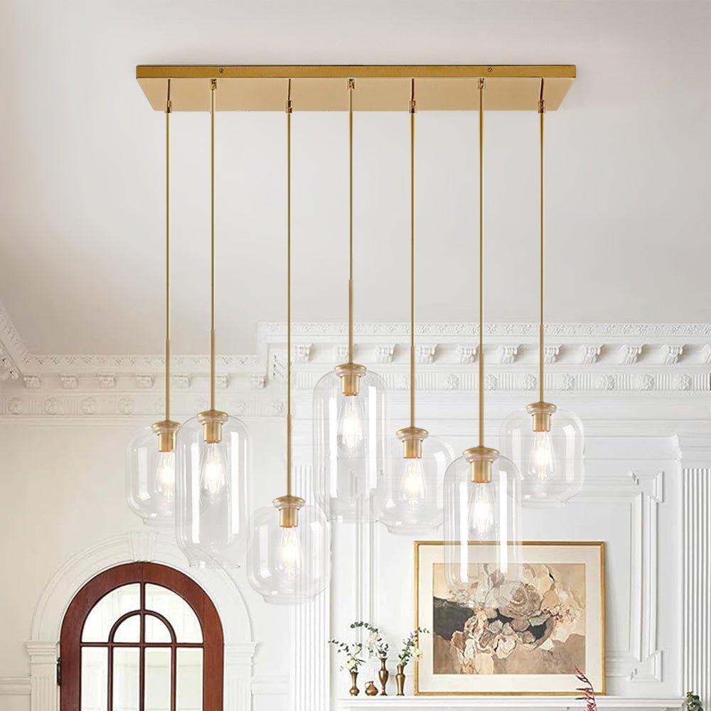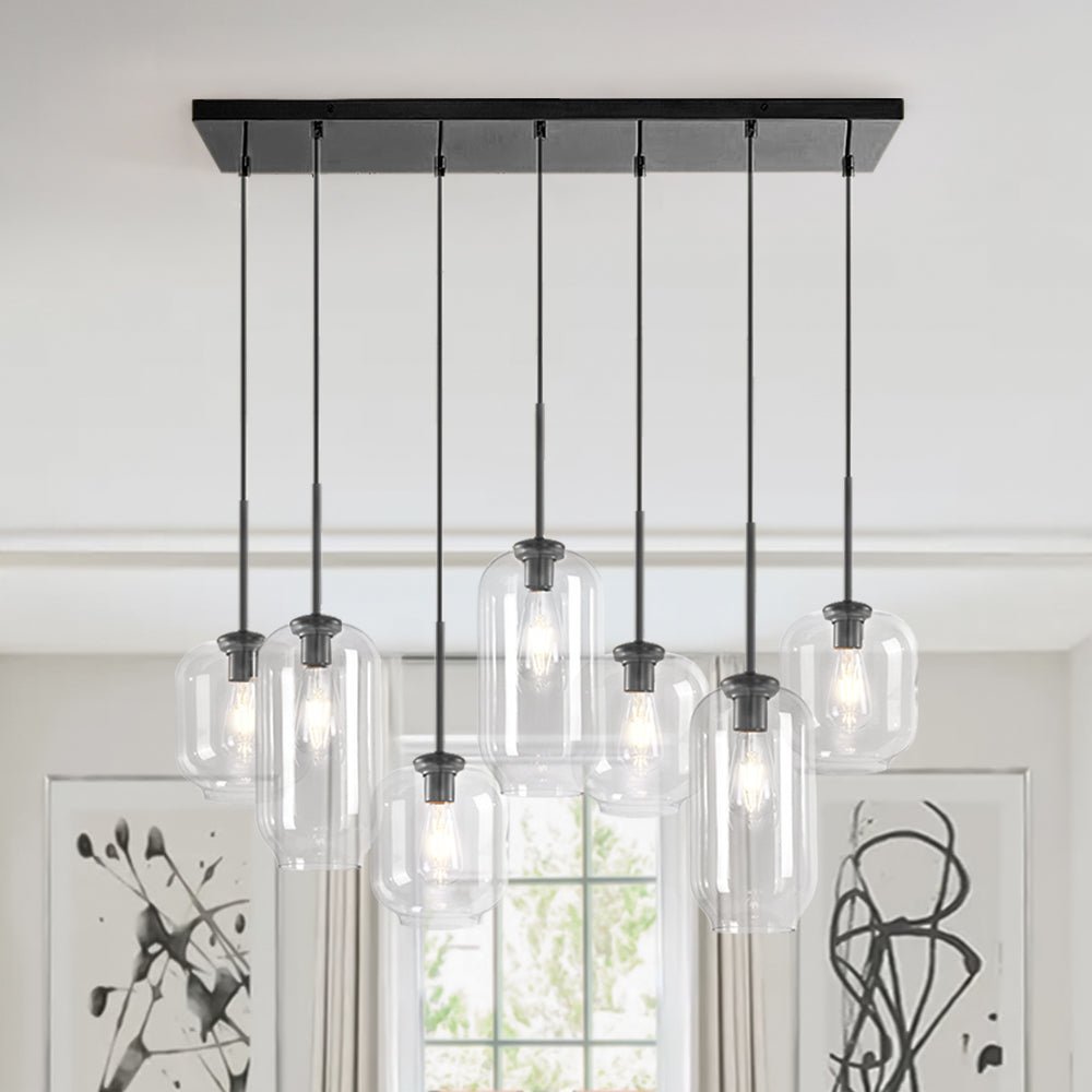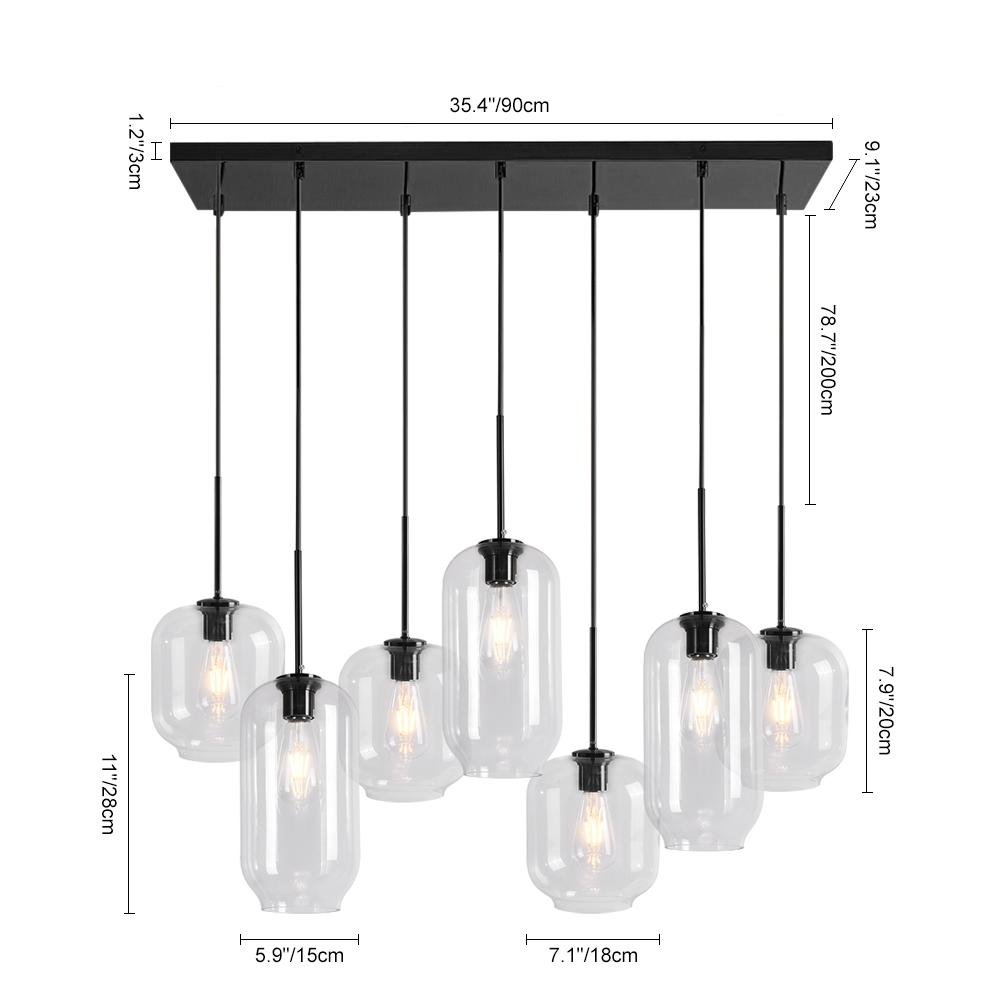 If you want something to refresh your dining ensemble or living interior. consider our 7-light kitchen island pendant. The rectangle canopy supports seven pendant lights that can adjust to different heights for building dramatic levels of lights and shadows. With seven E26/E27 medium-base bulbs (not included) ensconcing in the cylindrical clear glass shades in varying sizes. the 7-light chandelier illuminates those places that require task lightings. Make a statement with this functional and delicate island cluster pendant chandelier above your kitchen island. long dining table. or living room.