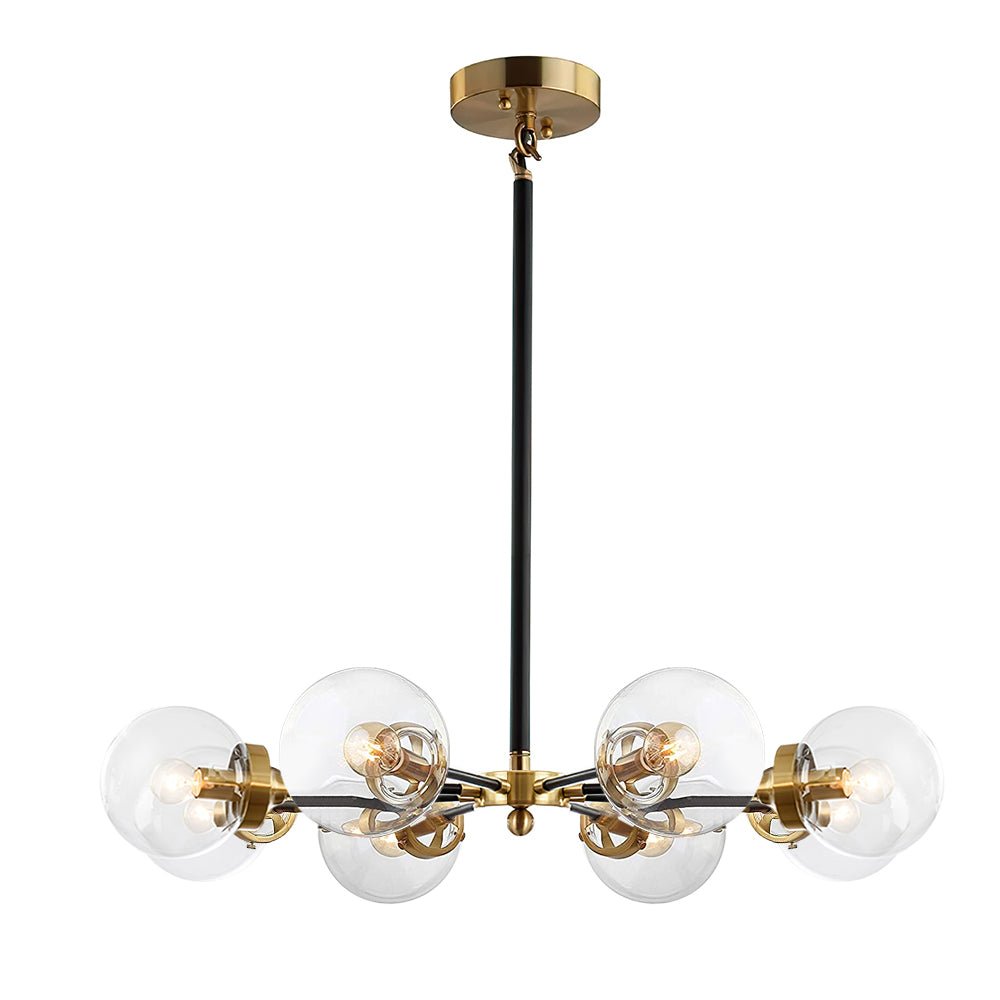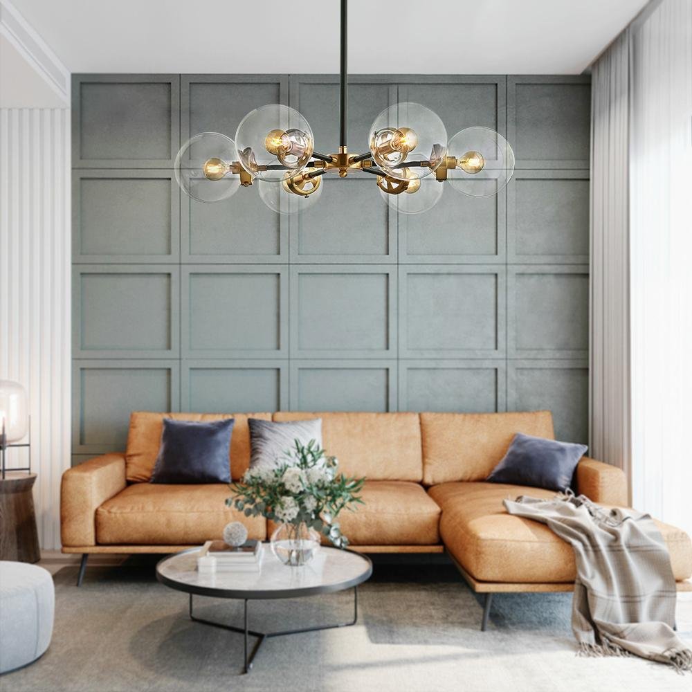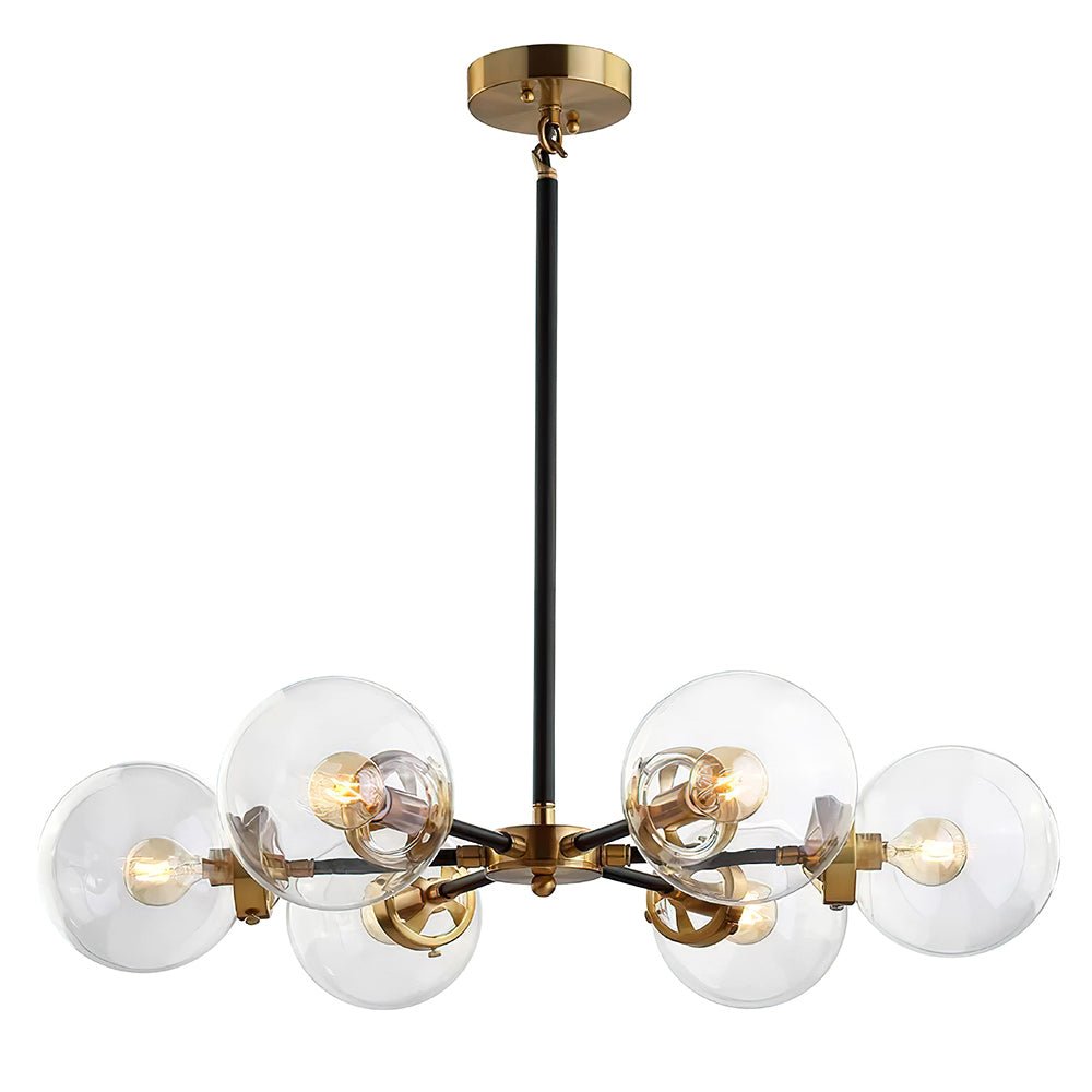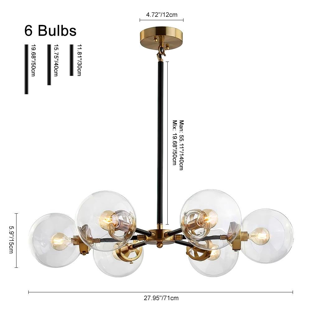 Our mid-century sputnik chandelier leaves no wires exposed with the handsome black and antique brass finish. Inspired by the classic sputnik design. this black and brass chandelier features several horizontal arms sticking out from the cylinder center. At the end of arms are supporting the striking glass globe shades. Inside ensconcing the E12/E14-base bulbs (not included). this multi globe chandelier works capably as a source of task lighting. We recommend giving a dimmer switch and dimmable bulbs (both not included) to gain the proper lighting from morning to evening. Thanks to the hook-loop design for connecting the down-pole and canopy. this black and brass chandelier is compatible with a sloped ceiling. This mid-century sputnik chandelier should be an ideal pick to upgrade your living room. dining room. bedroom. foyer. and entryway. Try this multi globe chandelier to amaze your guest!