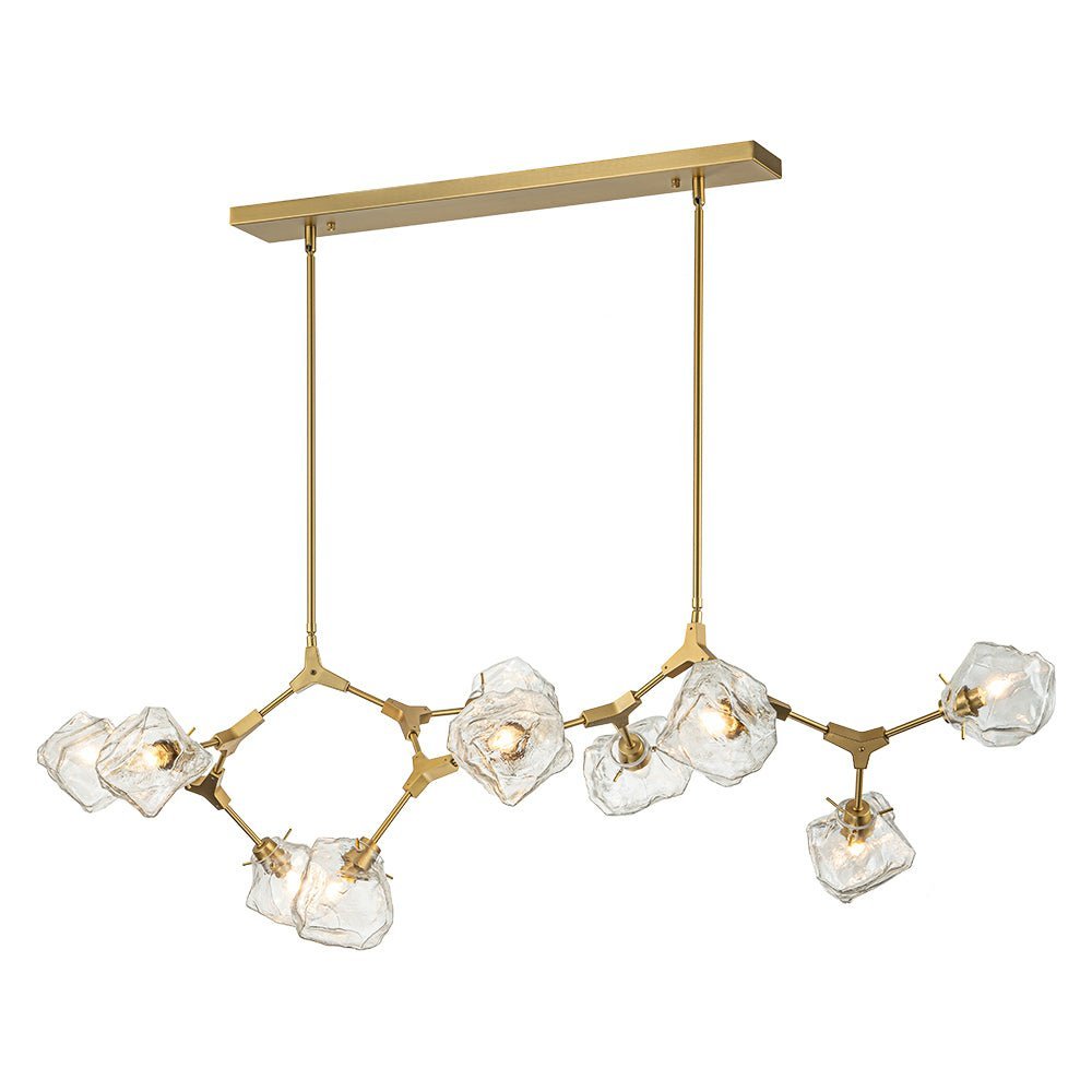 Like a shimmering treasure from the Frozen. our ice-style kitchen island pendant light casts an entrancing spell with its eye-catching organic form. Finished in brushed brass. a linear branching structure stretches up to hold an assortment of irregular rough glass cubes. hand-blown with a clear quality. Outfitted with ten E12 bulbs (excluded). this branch island chandelier emits a warm. inviting glow that diffuses cleanly through the glass. uplifting the room while showcasing the artisanal craftsmanship present in each piece. Bring a touch of enchanting elegance to the dining room. kitchen island. or living room with this 10-light glass ice style chandelier.