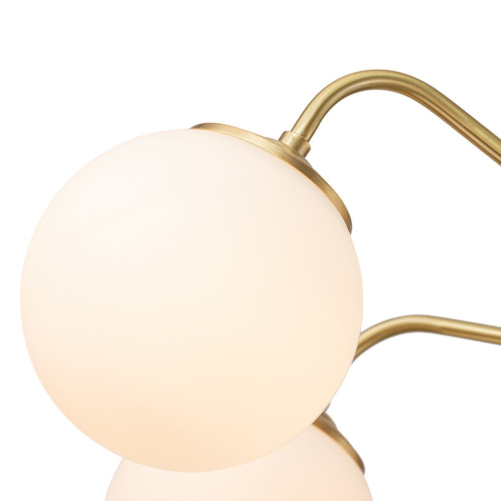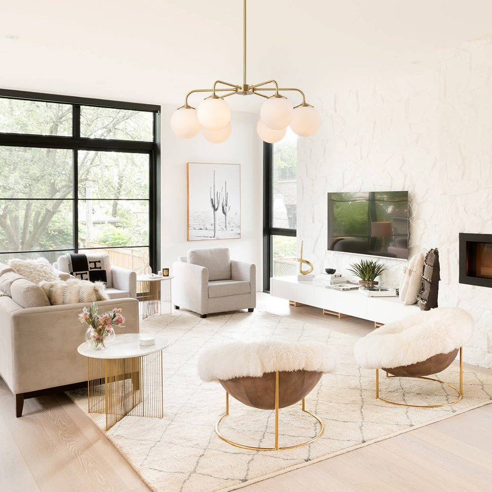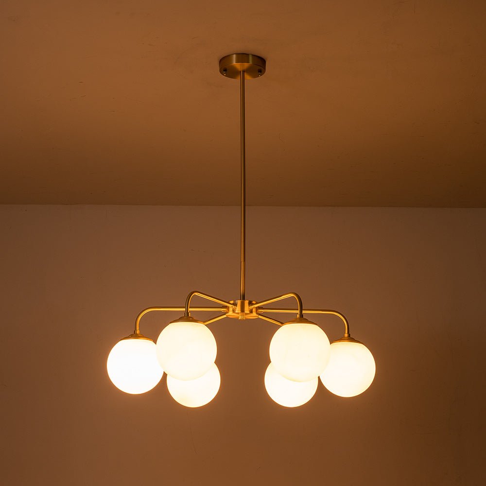 Inspired by classic sputnik design and alluring bubble style. this 6-light round chandelier is perfect for giving an understated vintage feel that’s rooted in Mid-Century art style. Crafted with rich brass finish. this exquisite sputnik chandelier features a sleek slim metal frame with six curved arms hanging opal glass spheres below which create an ethereal and cozy lighting effect. Bring effortless sophistication and elegant appeal to your dining room. entryway. living room. or bedroom with this milky white globe bubble chandelier.