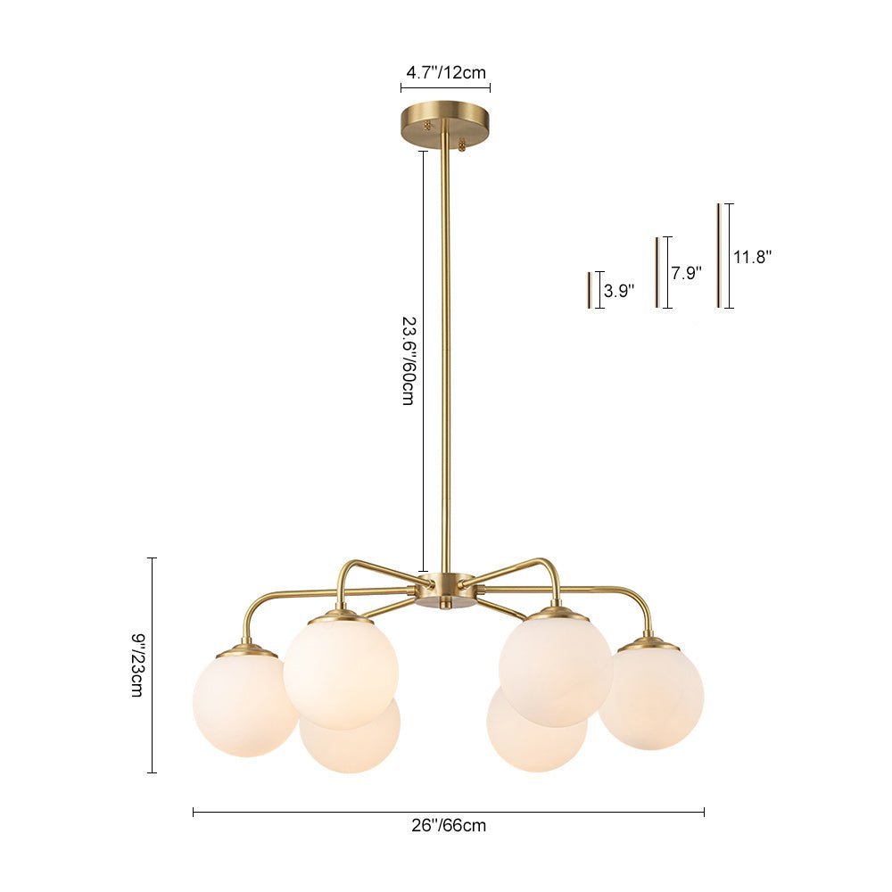 Six Lights • Opal Glass Globes • Round Sputnik Style • Mid-century Modern • Brass Finish • E26 Medium-base Bulbs (Not Included) • Hardwired • UL Listed