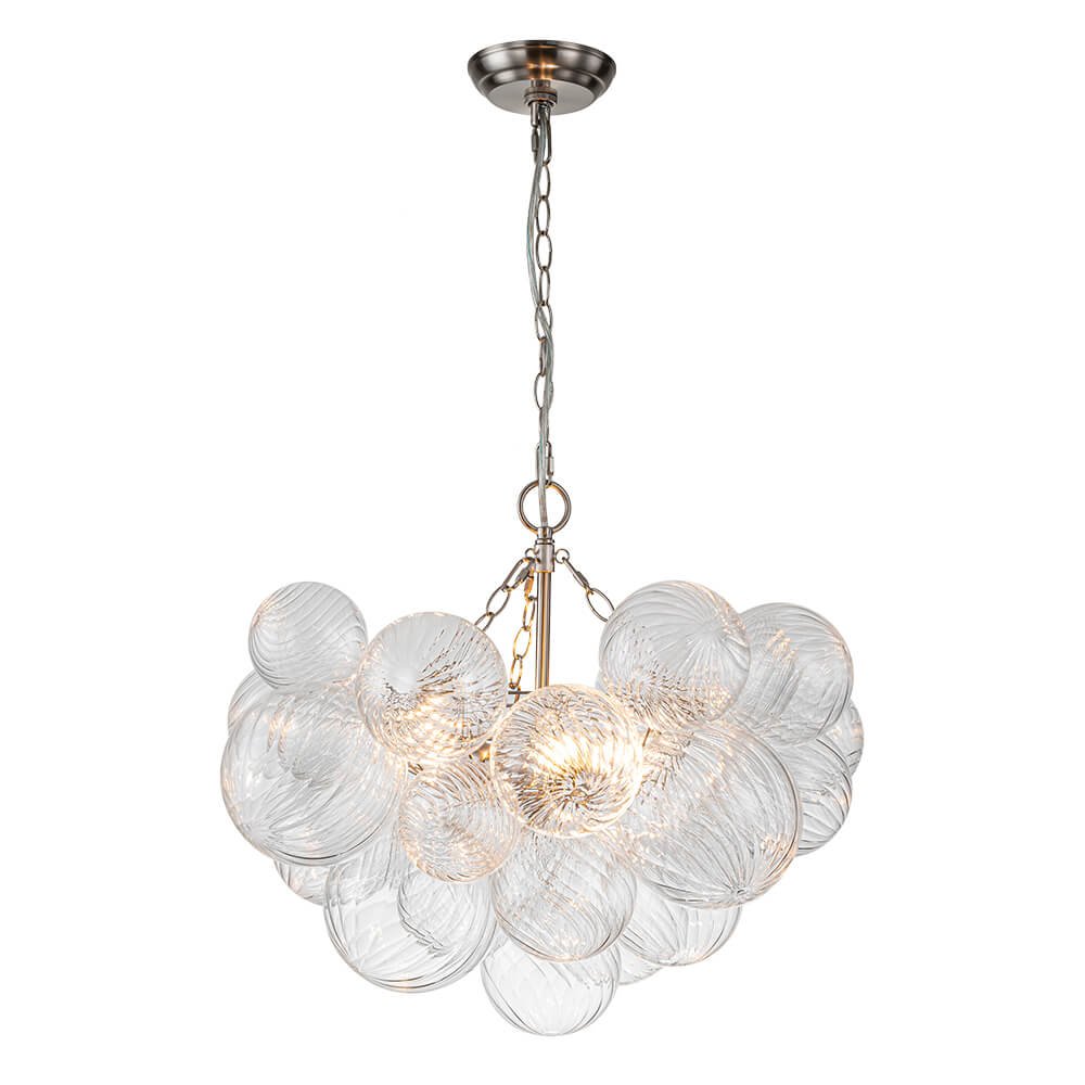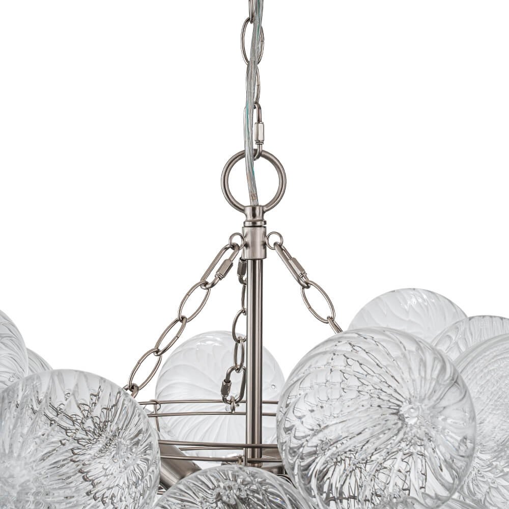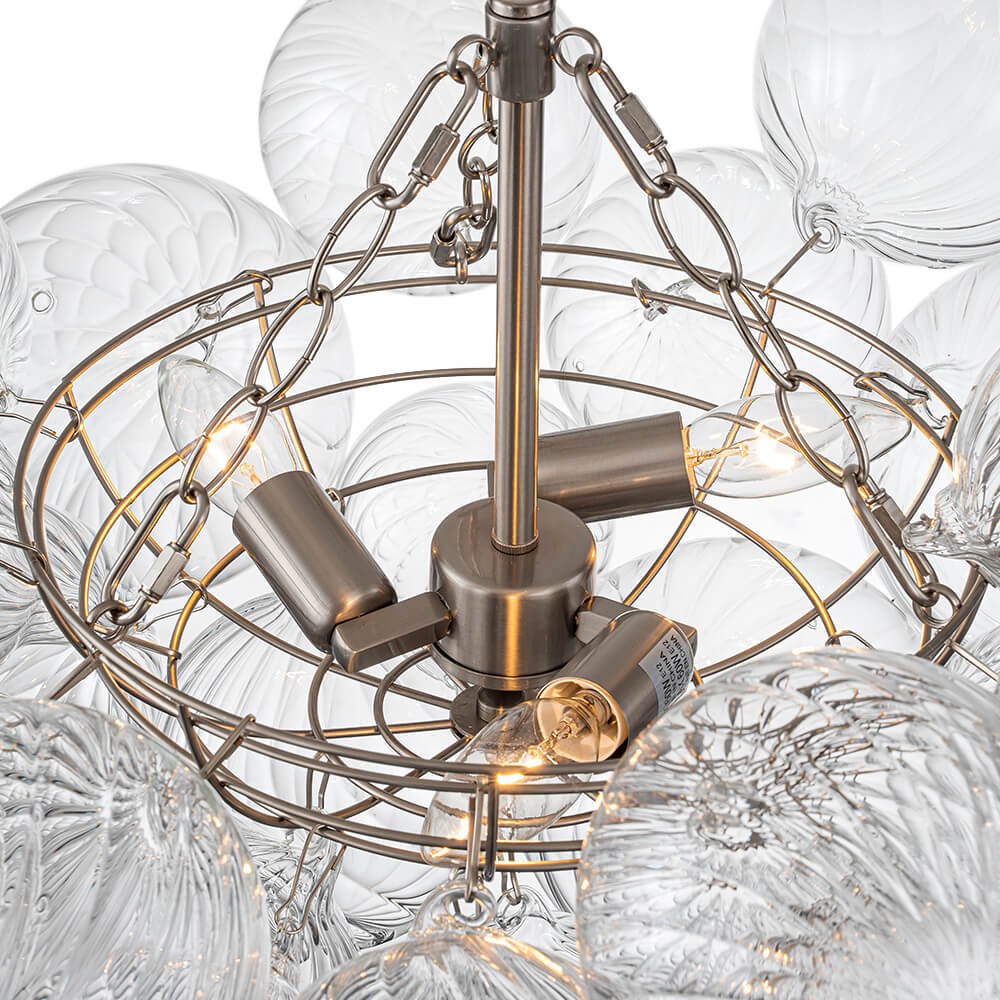 Grouped in stunning clusters. this modern bubble chandelier offers a strikingly romantic and fantasy visual. This cluster globe chandelier features a token of elaborate ribbed glass globes gathering to a bowl frame finished in a luxury brass or nickel finish. When turning on this cluster globe bubble chandelier. the lighting flows on the ribbed glass like the champagne and diffuses a gorgeous ambiance to your space. This fabulous cluster glass globe chandelier funky chandelier is a bold magnificent accent that accentuates the decor in any living room. dining room. entry. bedroom. bathroom. or hall.