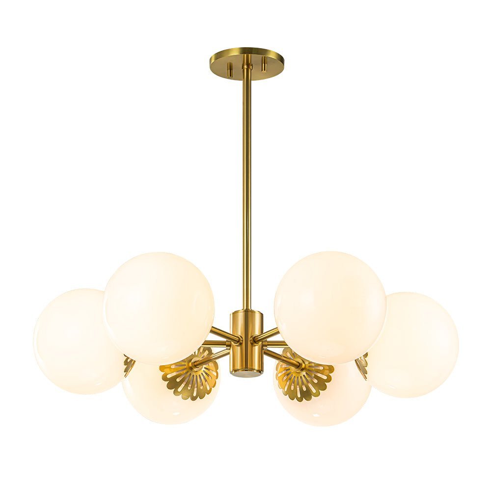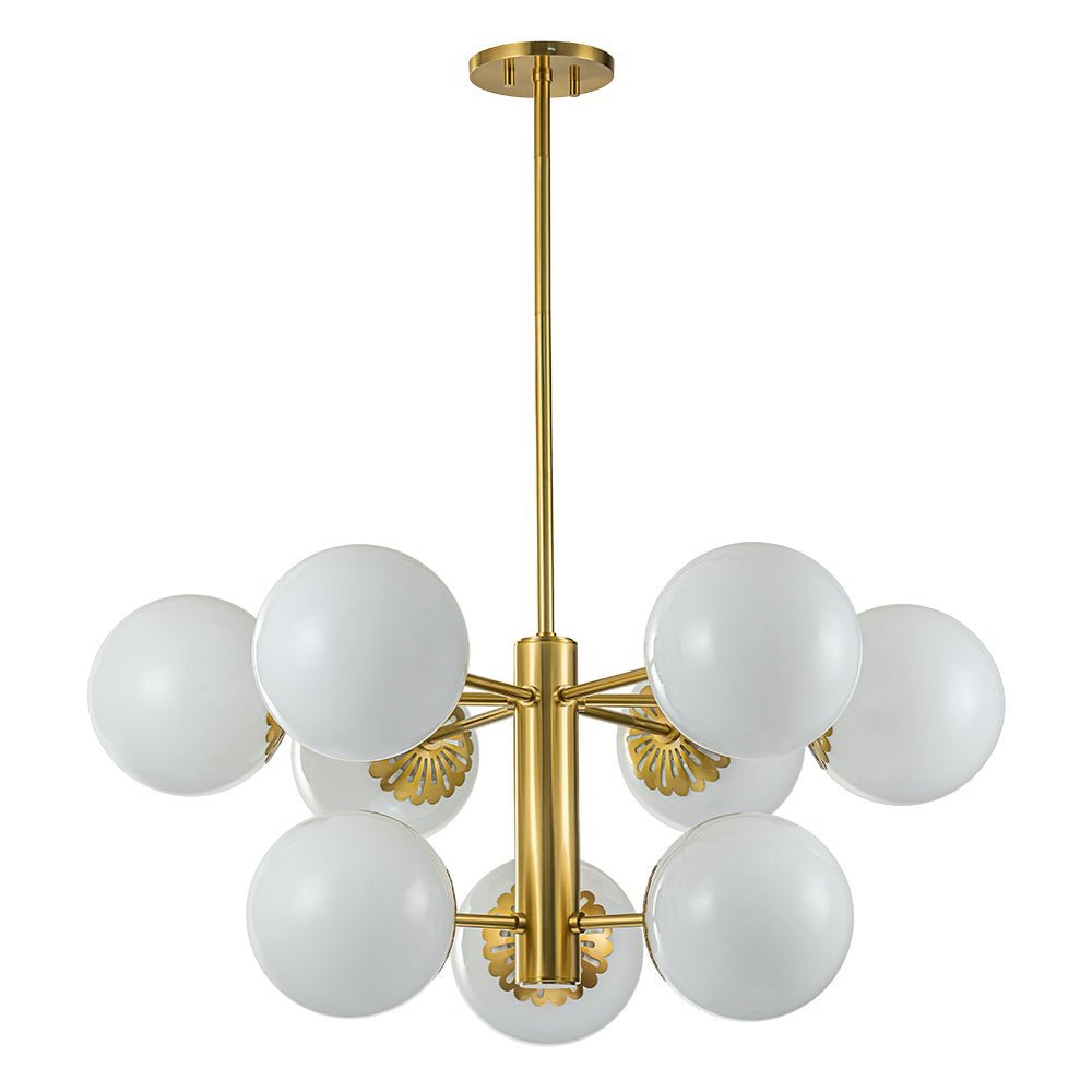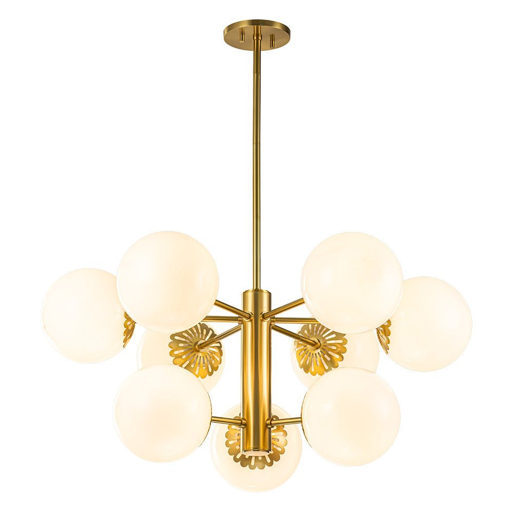 Six/Nine Lights • Sputnik Style • Opal Glass Globes • Blossom Design • Polished Brass Finish • E26 Medium Bulbs (Not Included) • Hardwired • UL Listed