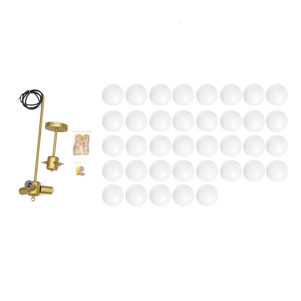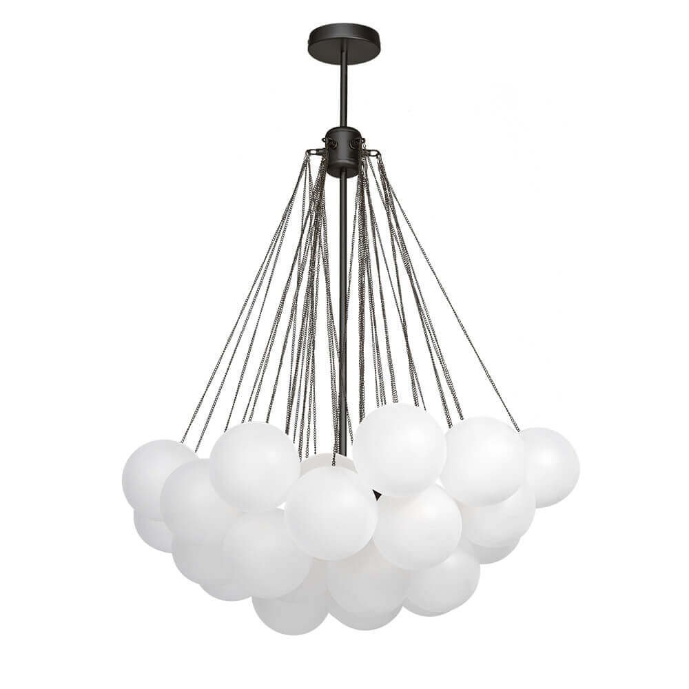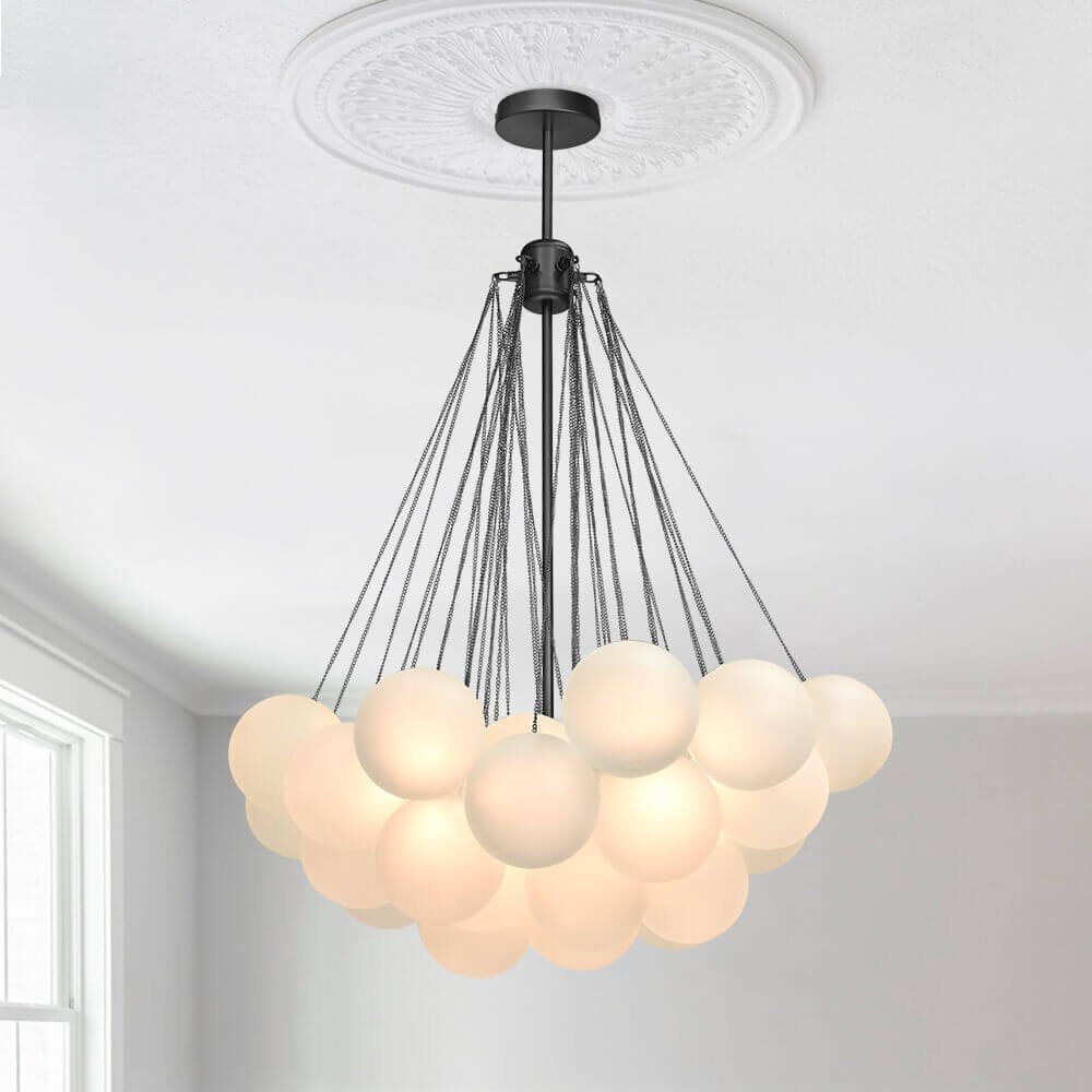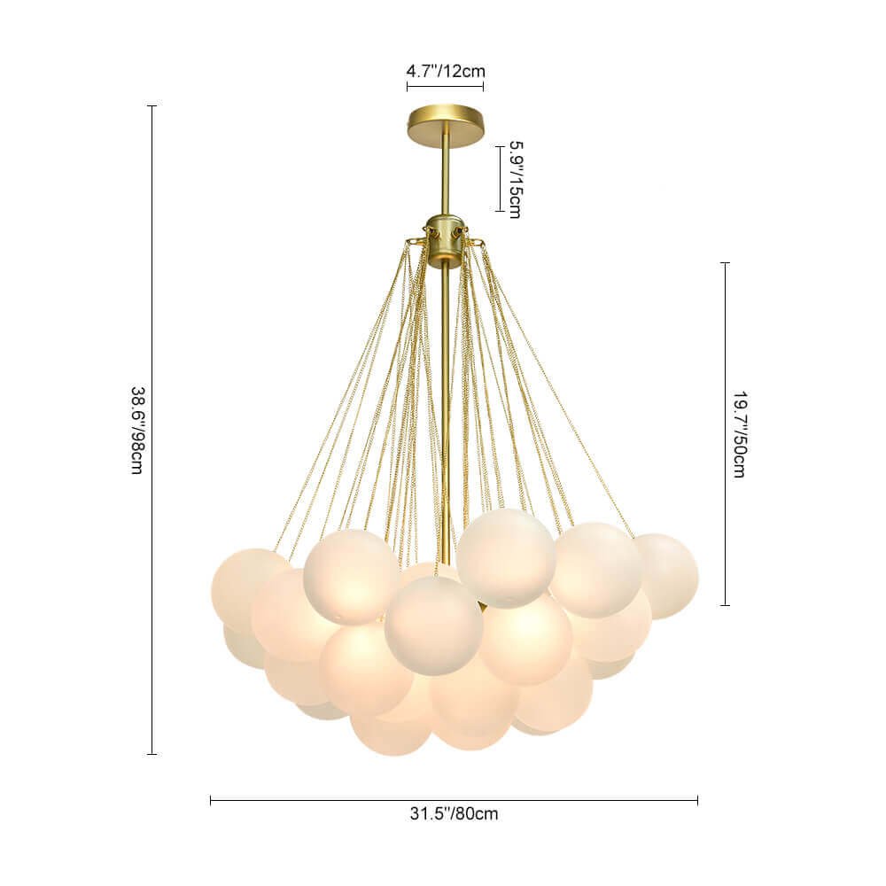 Full of graceful aesthetics in a cluster globe design. this bubble chandelier is a statement piece to spark conversation in the living room. dining room. lobby. foyer. or bedroom. Hung by refined slim chains. 19 or 37 globes in matte opal glass gathering together like an airy. floating cloud. is the essence of this cluster bubble chandelier. When lit up. three E26/E27 medium-base bulbs (not included) casts soft ambient lighting through the layers of frosted glass orbs. The gorgeous brass finish injects a chic and luxurious accent to this glass globe chandelier while the black finish presents a modern sleek touch.