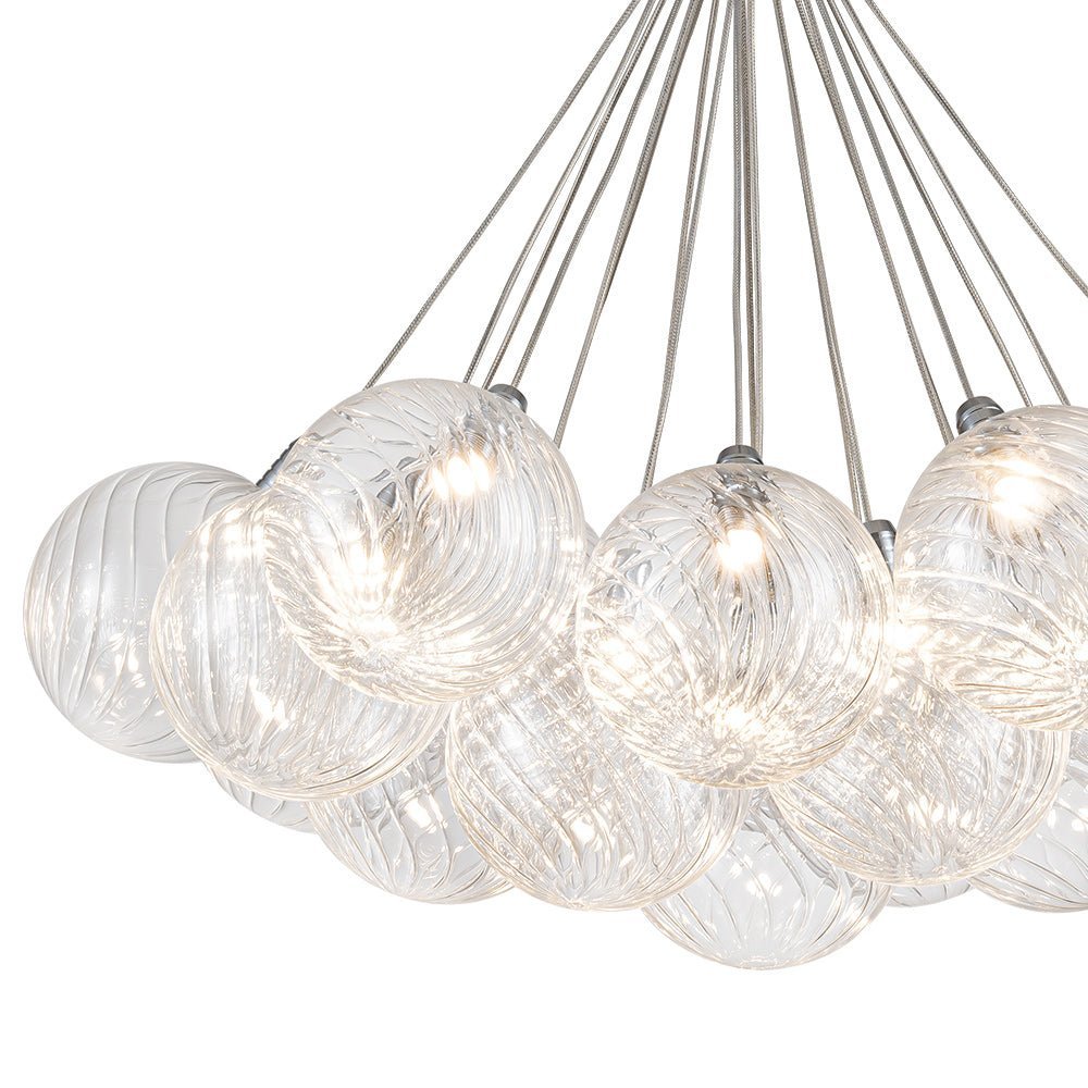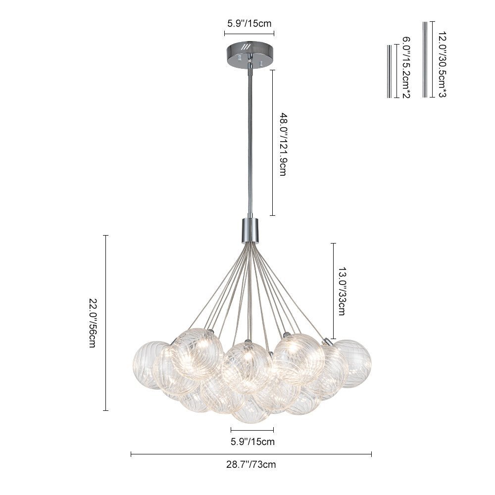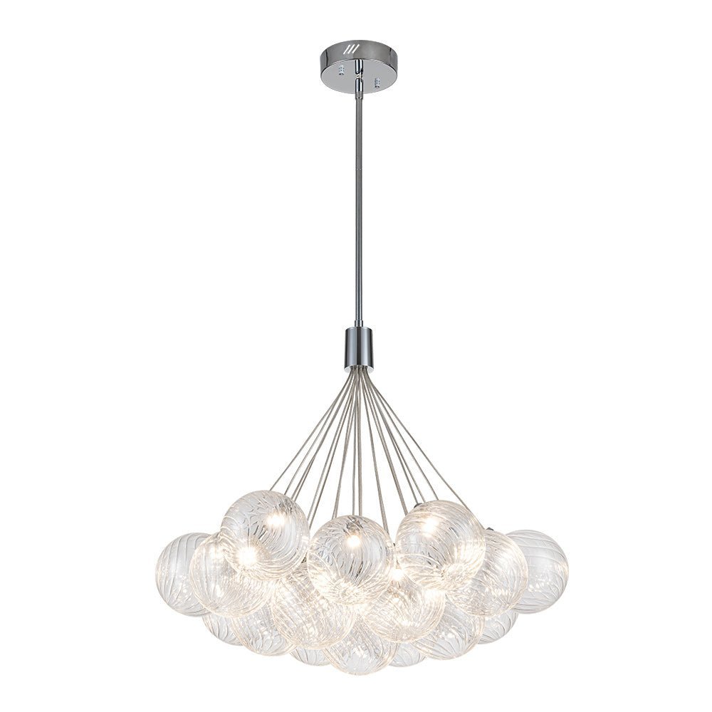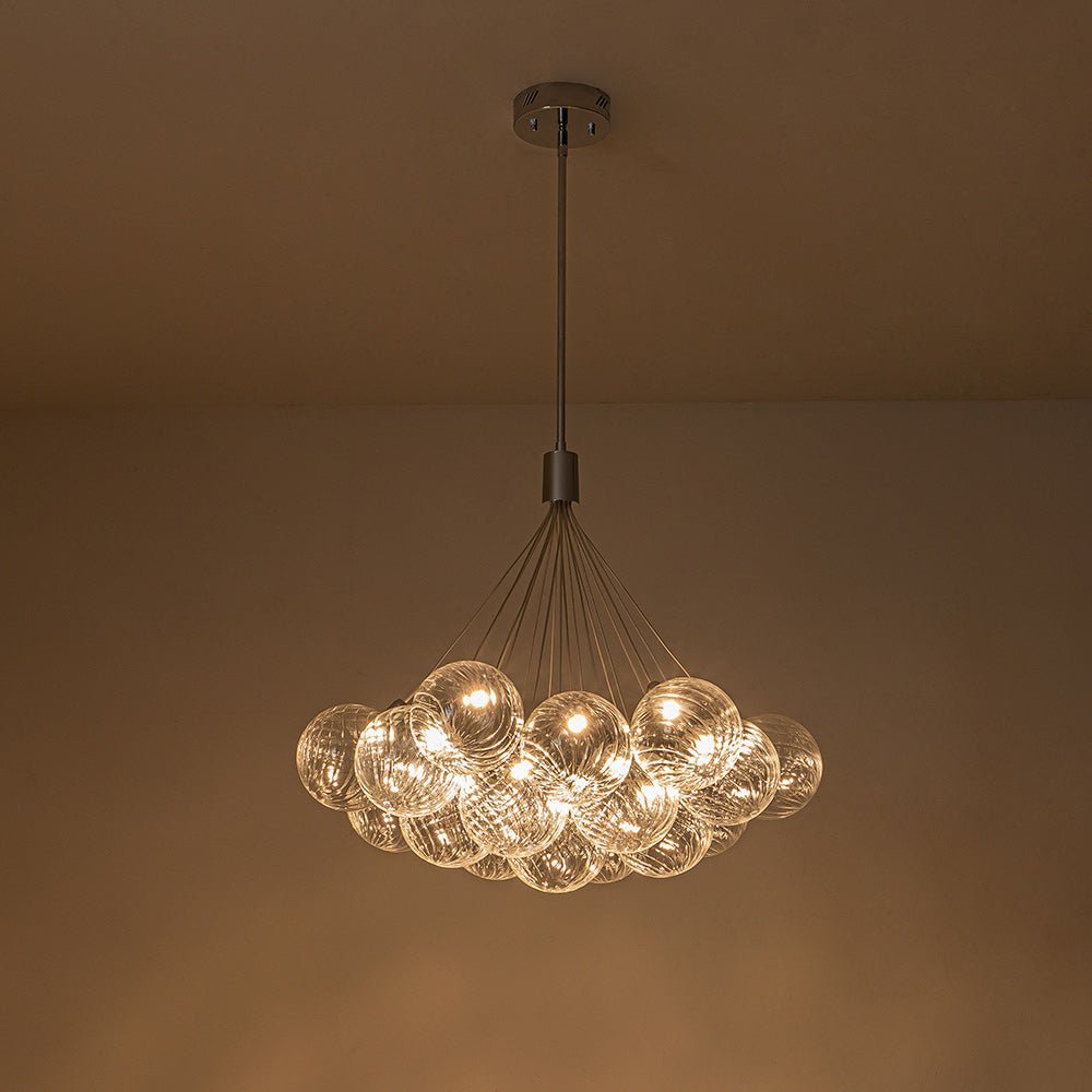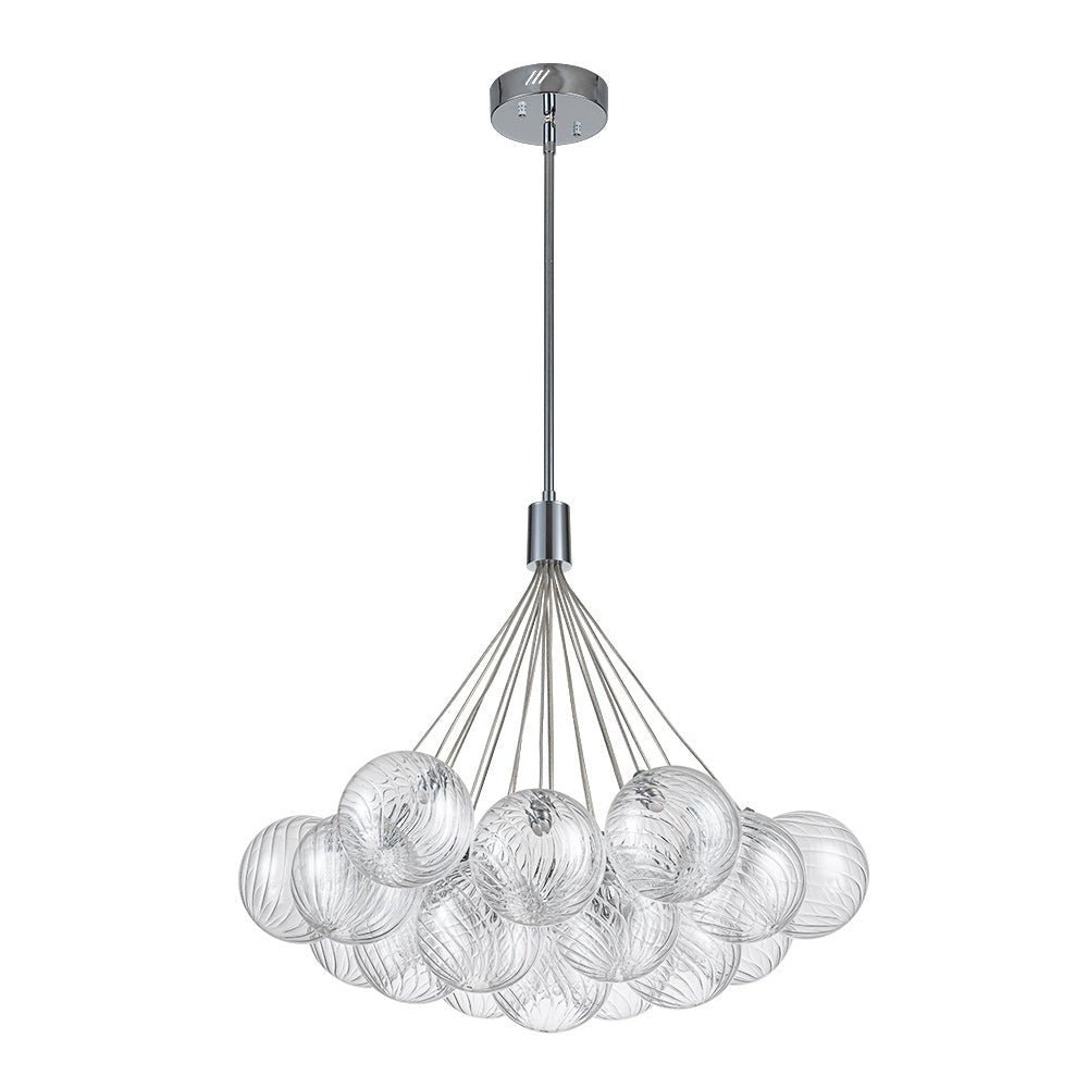 An embodiment of modern romance and function. our 19-light dimmable bubble chandelier is a statement piece to spark conversation in the living room. dining room. lobby. foyer. entry. or bedroom. Crafted of intricate swirl-ribbed clear glass. each orb houses the included LED bulb. gathering together to cast warm and efficient lighting. The dimmable feature allows for flexible customization of lighting. providing both convenience and practicality. Finished in polished chrome. this cluster glass globe chandelier presents sleek refinement and ethereal elegance to enliven your space.