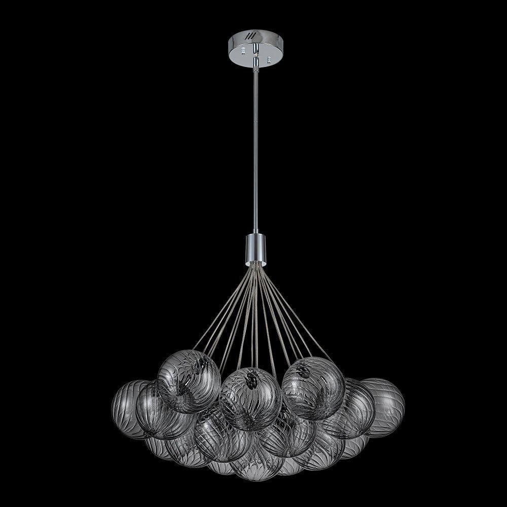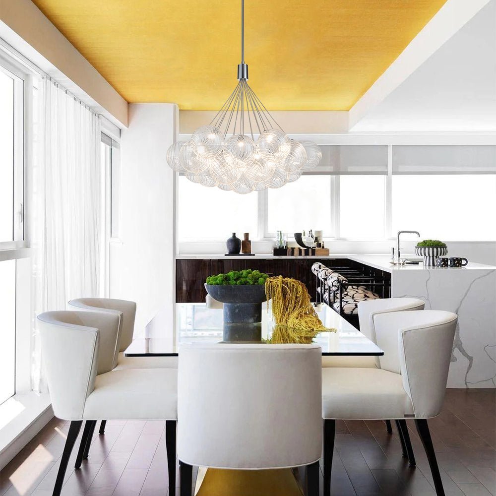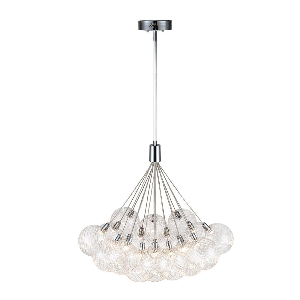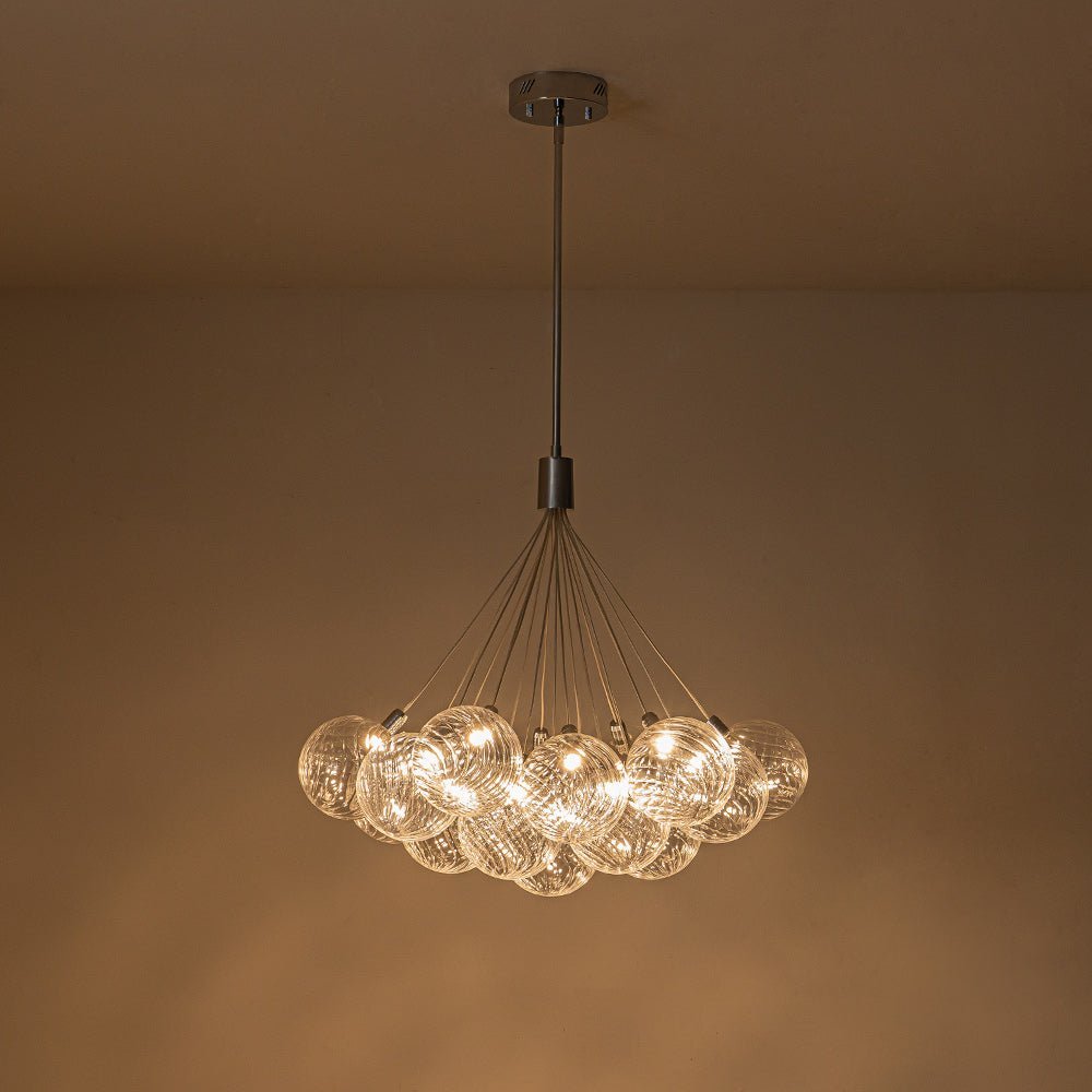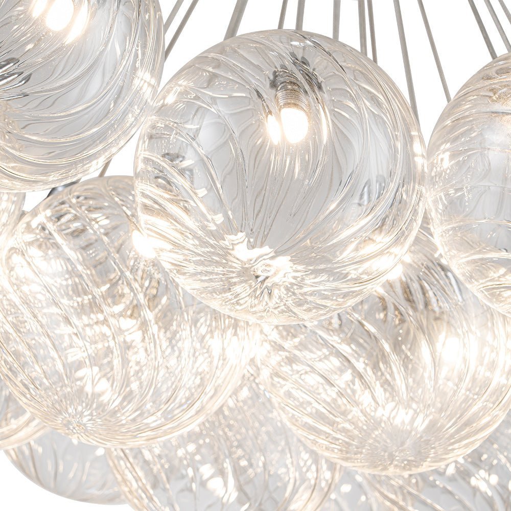 An embodiment of modern romance and function. our 19-light dimmable bubble chandelier is a statement piece to spark conversation in the living room. dining room. lobby. foyer. entry. or bedroom. Crafted of intricate swirl-ribbed clear glass. each orb houses the included LED bulb. gathering together to cast warm and efficient lighting. The dimmable feature allows for flexible customization of lighting. providing both convenience and practicality. Finished in polished chrome. this cluster glass globe chandelier presents sleek refinement and ethereal elegance to enliven your space.