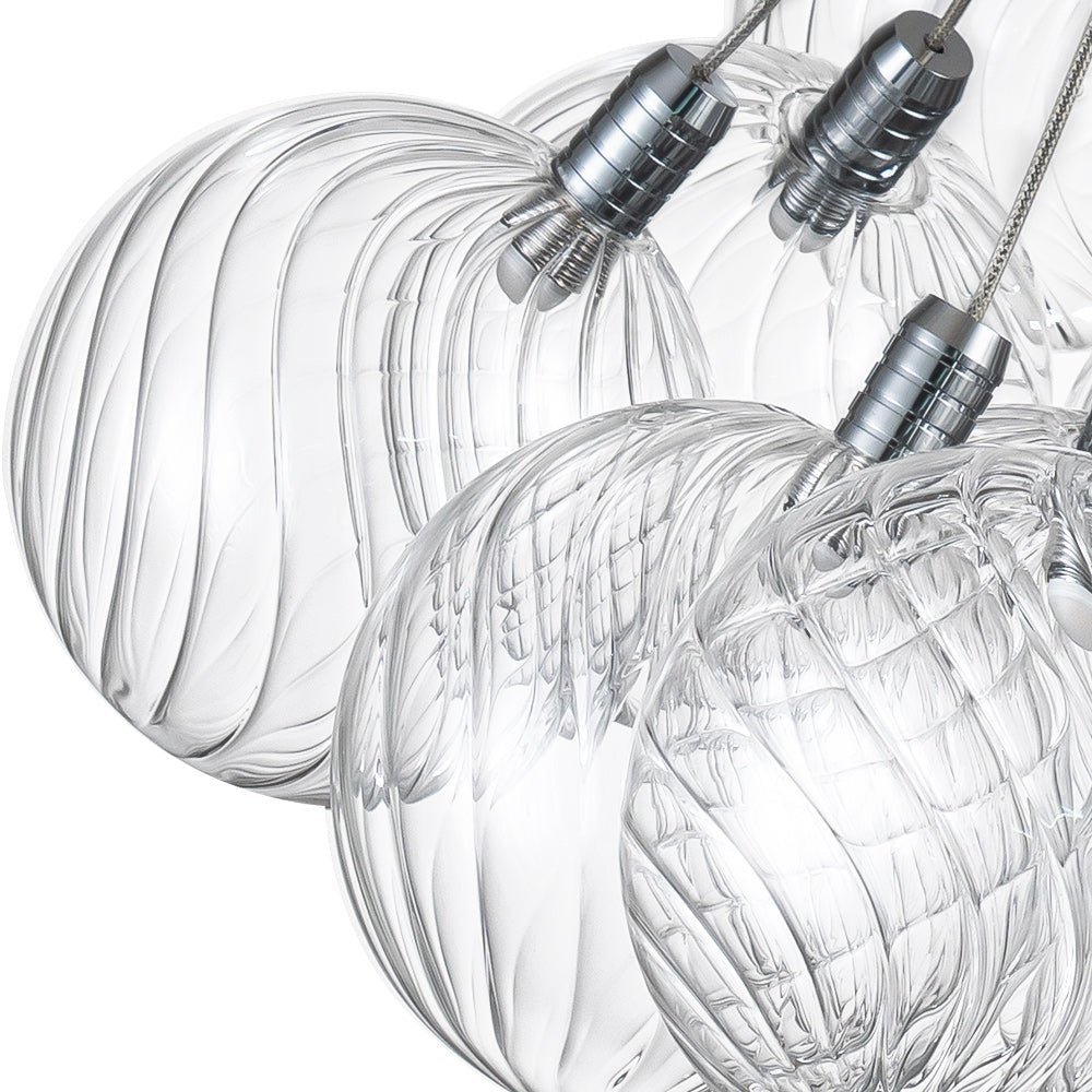 Nineteen Lights • Ribbed Glass Globes • Bubble Style • Chrome Finish • Dimmable Lighting • 5W LEDs • 3000K • Hardwired • UL Listed