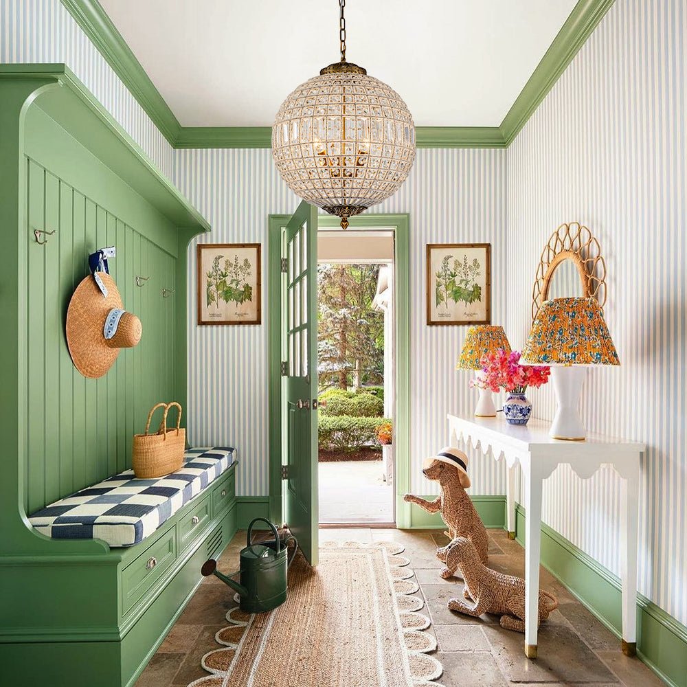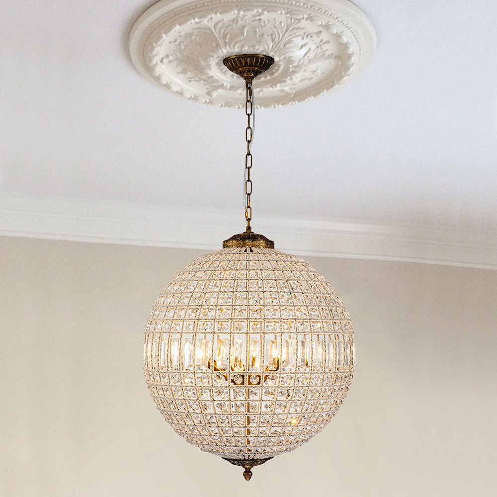 Welcome a gorgeous and vintage-chic vibe to your space with this orb pendant light. Finished in antique brass. this crystal ball chandelier boasts its classic and chic French style. Varying sizes of faceted glass crystal fill in an open orb frame to create this magnificent crystal globe chandelier. The bulbs (not included) cast from inside to sparkle out through the crystal decorations will upgrade the ambiance in the space. This French wide crystal globe chandelier produces unforgettable glitter to your dining table. living room. entryway. lobby. or hotel.