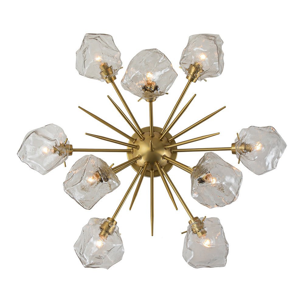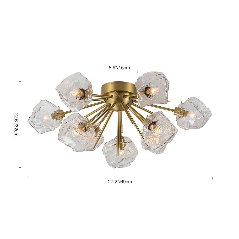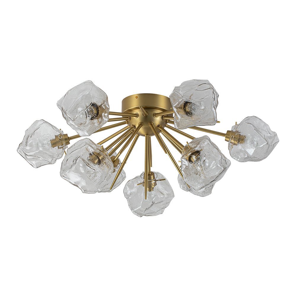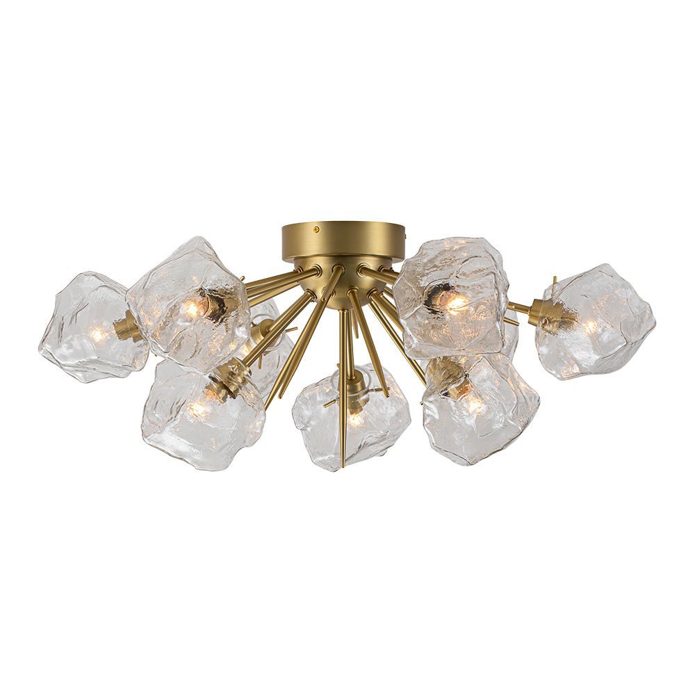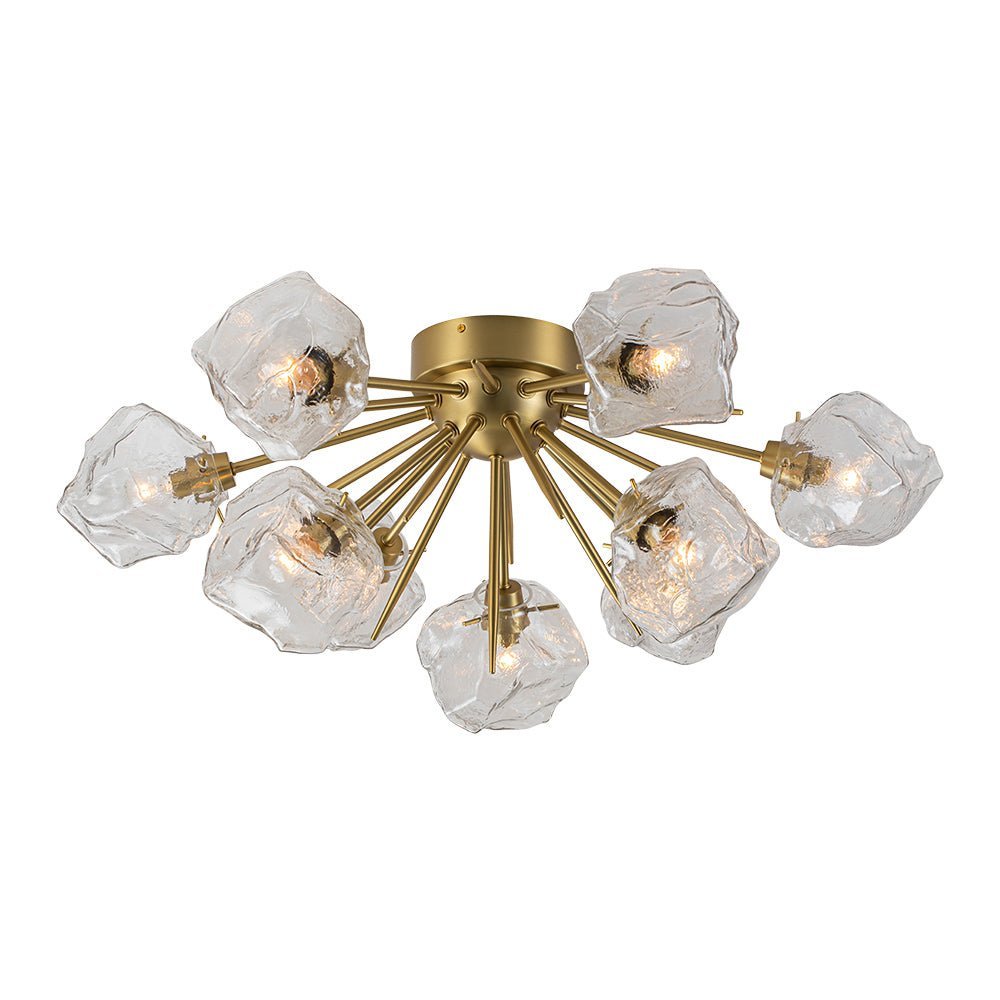 An arresting piece to glam your home decor. this sputnik ceiling light fixture lends a cutting-edge and impactful result. Born for blossoming in the Frozen world. this 9-light semi flush mount chandelier features a sunburst-style frame adorned with irregular clear glass shades resembling ice cubes. A brushed brass finish gives an air of regal elegance. This creative ice style sputnik chandelier transcends ordinary lighting. perfect to enhance a dining room. entryway. bedroom. bathroom. or living area.
