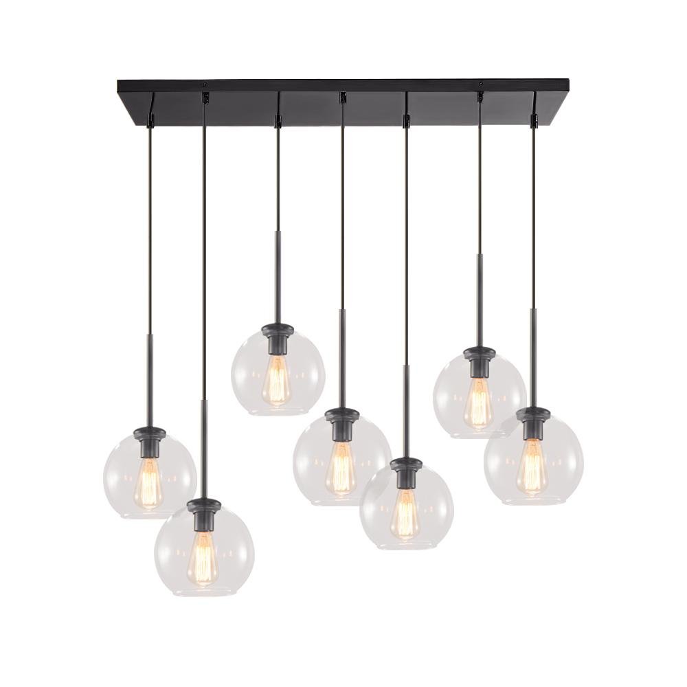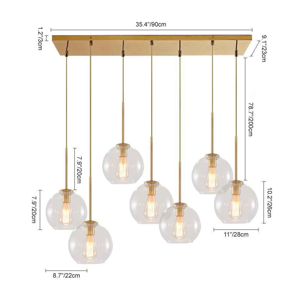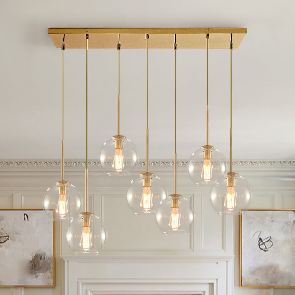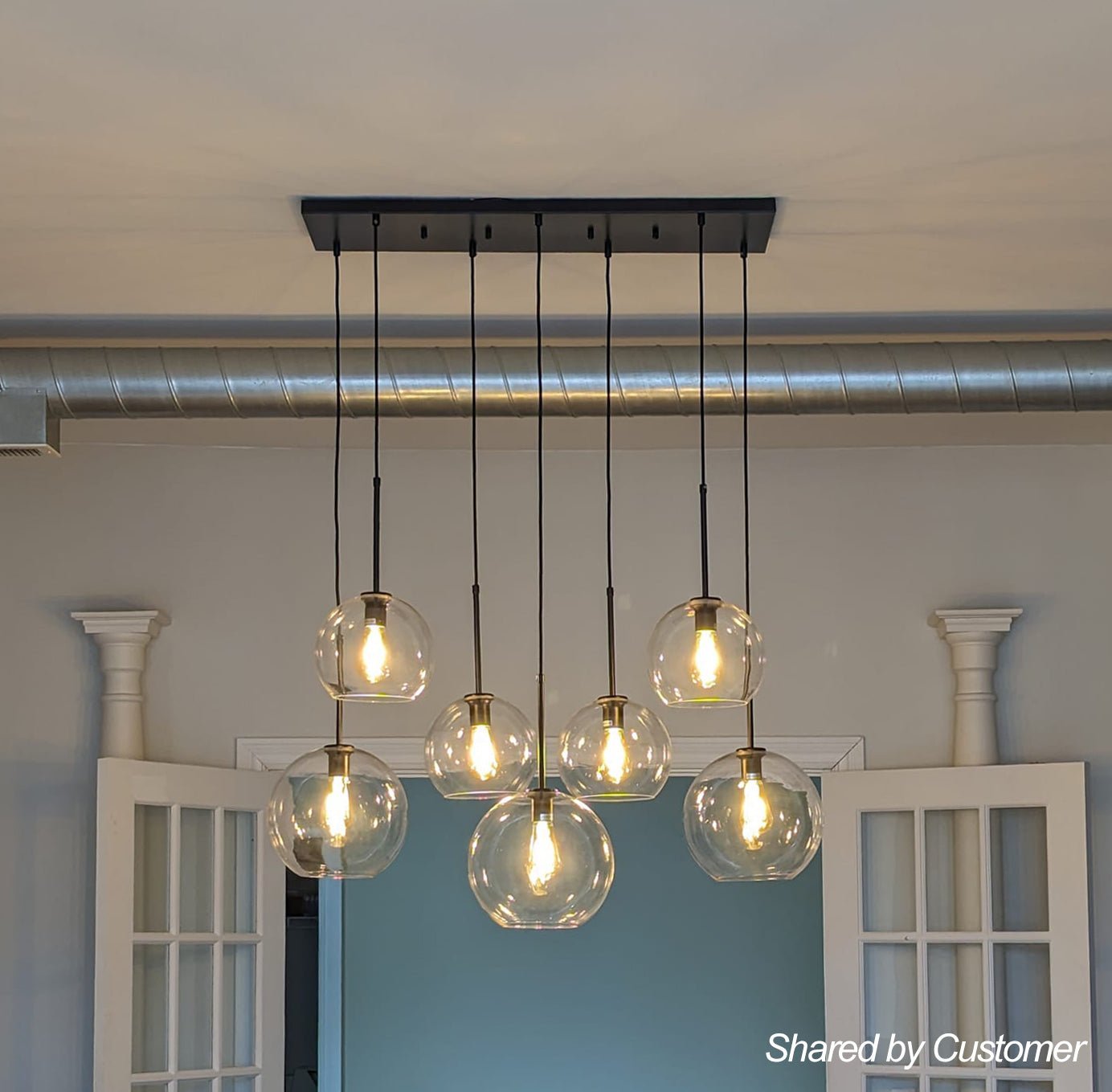 From kitchen islands in need of brightness to long dining tables searching for shine. a kitchen island pendant lighting is always a fan favorite. Our kitchen globe light showcases seven open-mouth glass globe shades suspended from a rectangle canopy. Seven hanging cables allow you to outfit the shades in varying heights. Highlighted by a chic brass or black finish. the kitchen island pendant lighting is full of delicate mid-century touch. Accommodating E26/E27 medium-base bulbs (not included). this globe cluster chandelier no doubt works capably as a task lighting fixture. Once turned on. this globe cluster kitchen island pendant light presents a shining bubble effect to fill your room that delights the eyes.