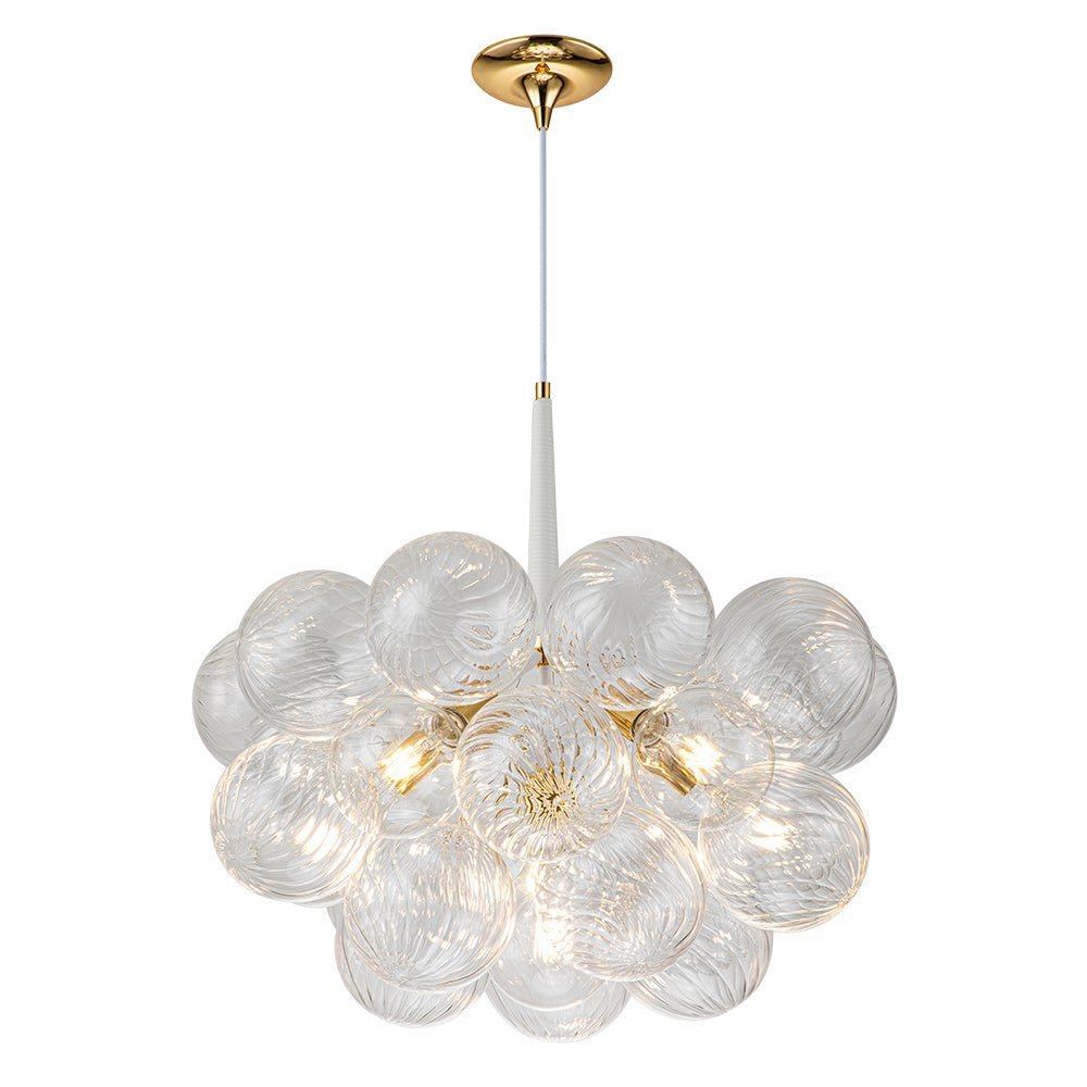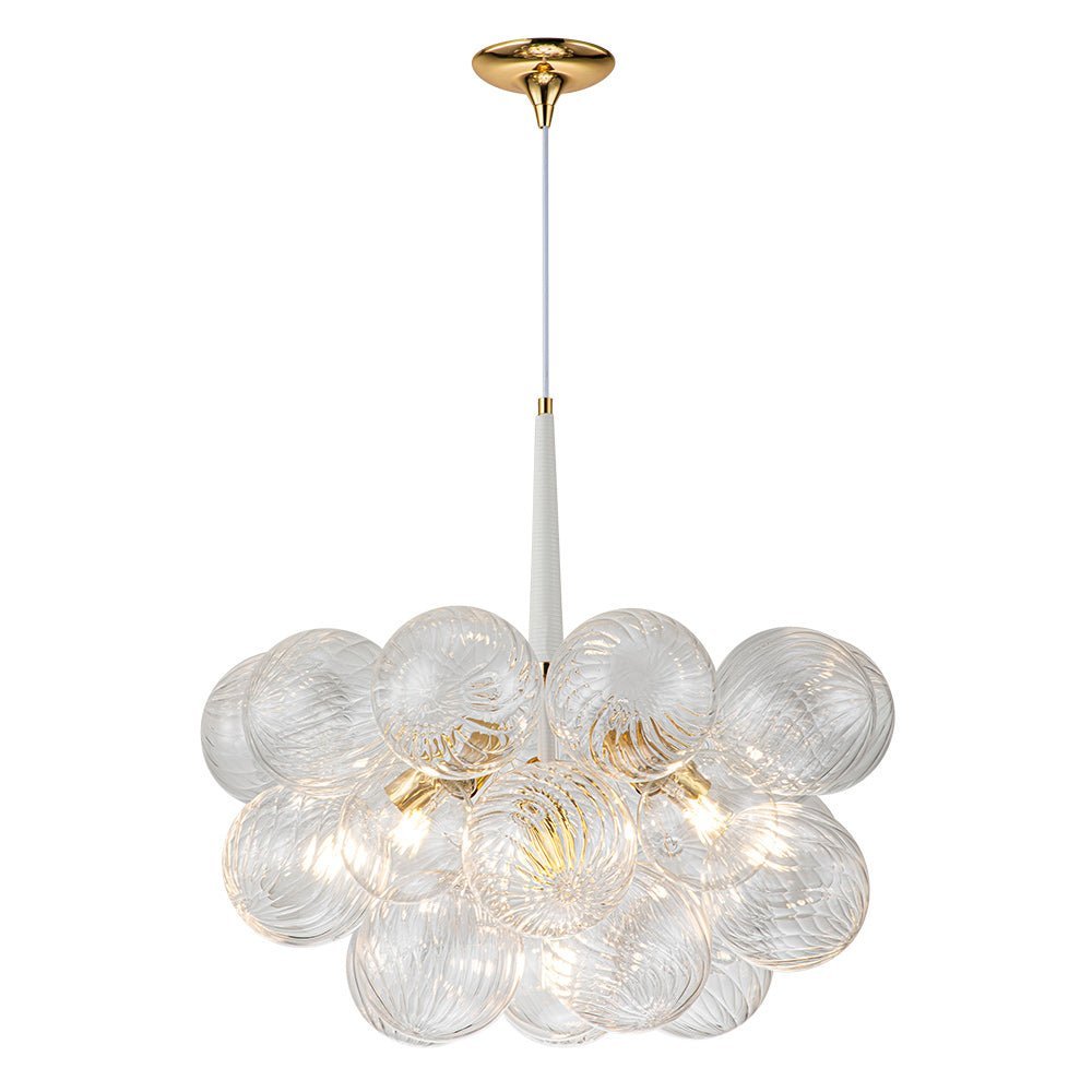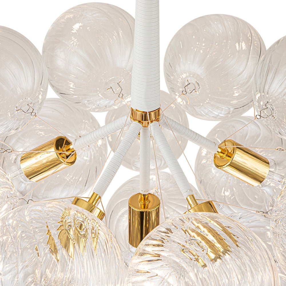 This cluster glass globe chandelier is an artistic treat that unlocks a world of sophistication. Featuring 20 exquisite swirled ribbed glass globes and six dimmable LED G125 bulbs gathered on six metal arms. this bubble chandelier resembles a bouquet of flowers in full bloom. When turned on. the light flows through the swirled glass globes. creating an elegant and alluring ambiance. Add a visually stunning enhancement to living rooms. dining rooms. bedrooms. foyers. bathrooms. and entryways with this modern cluster ribbed glass globe bubble chandelier.