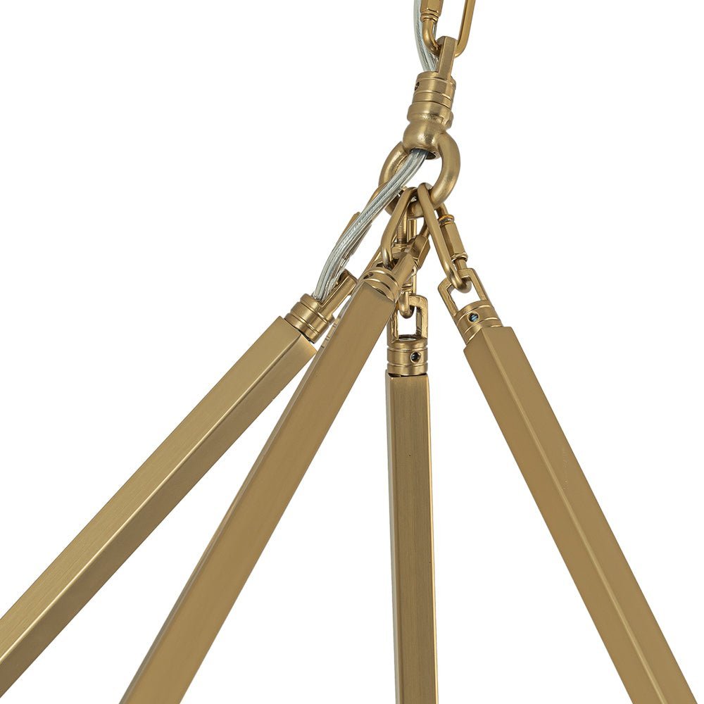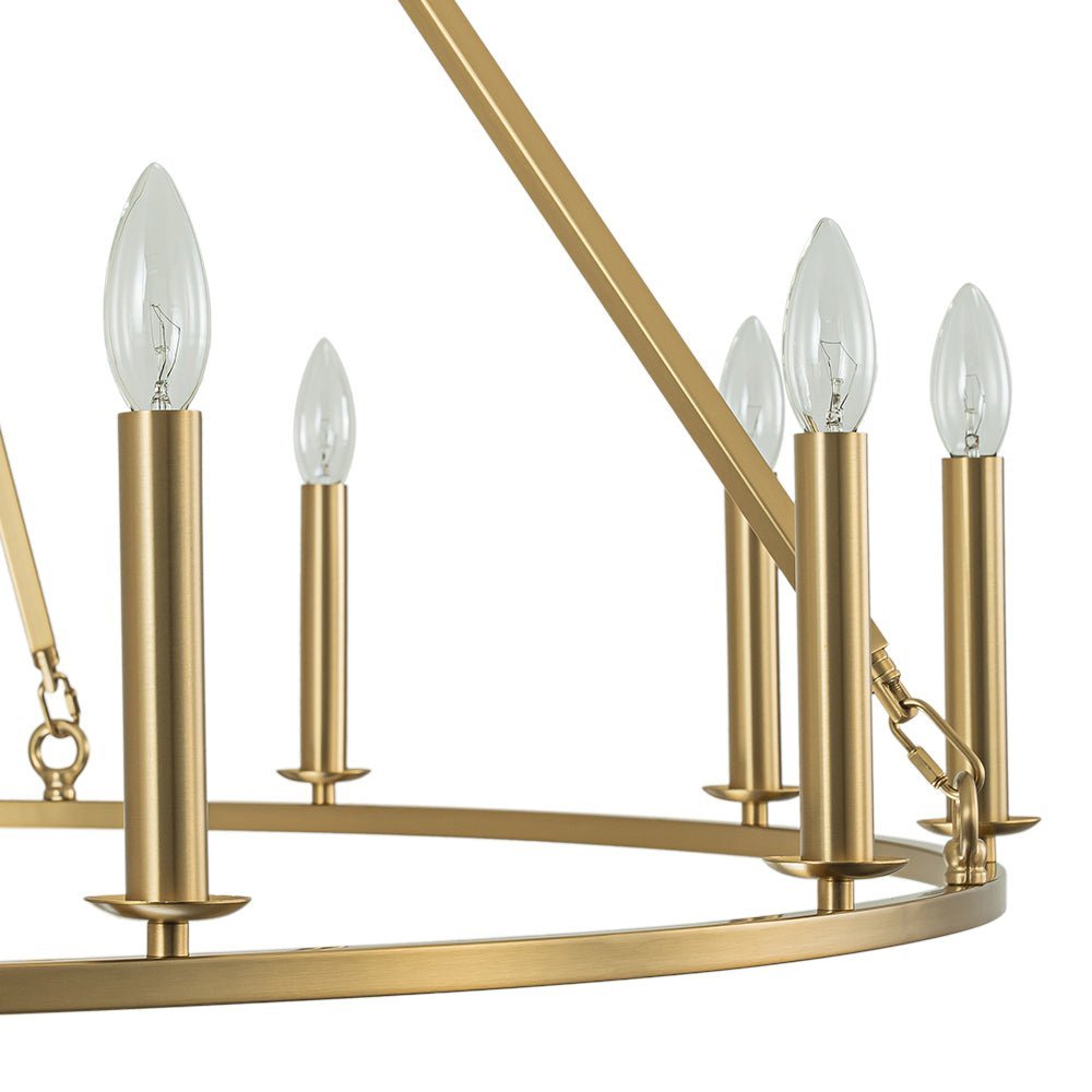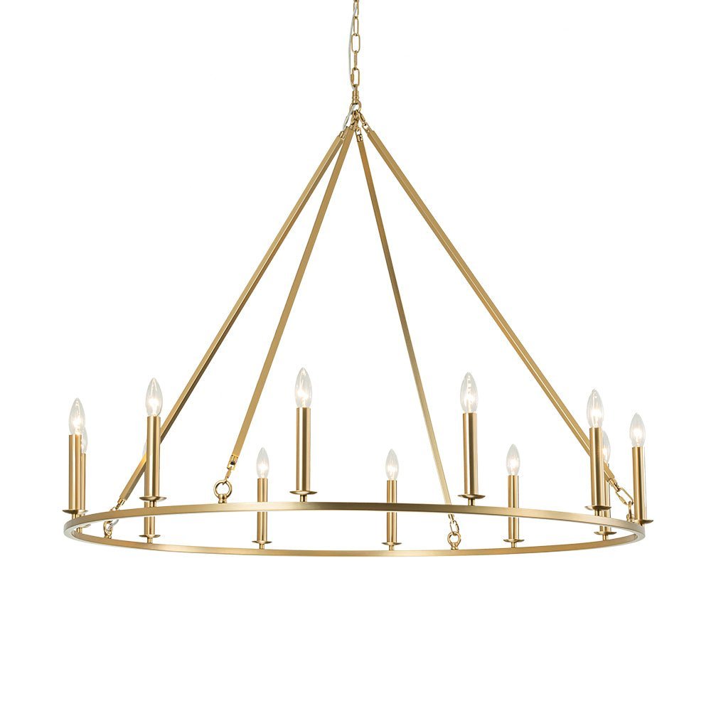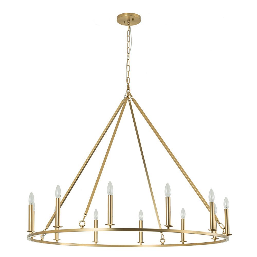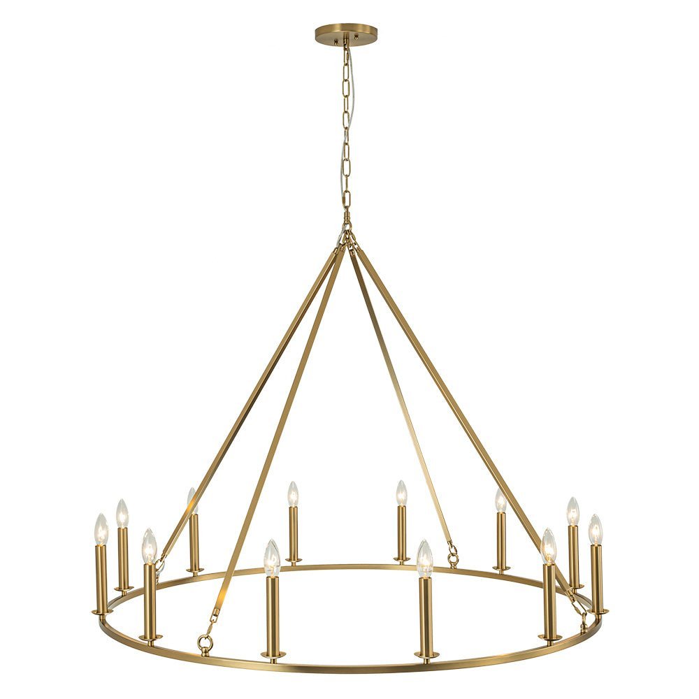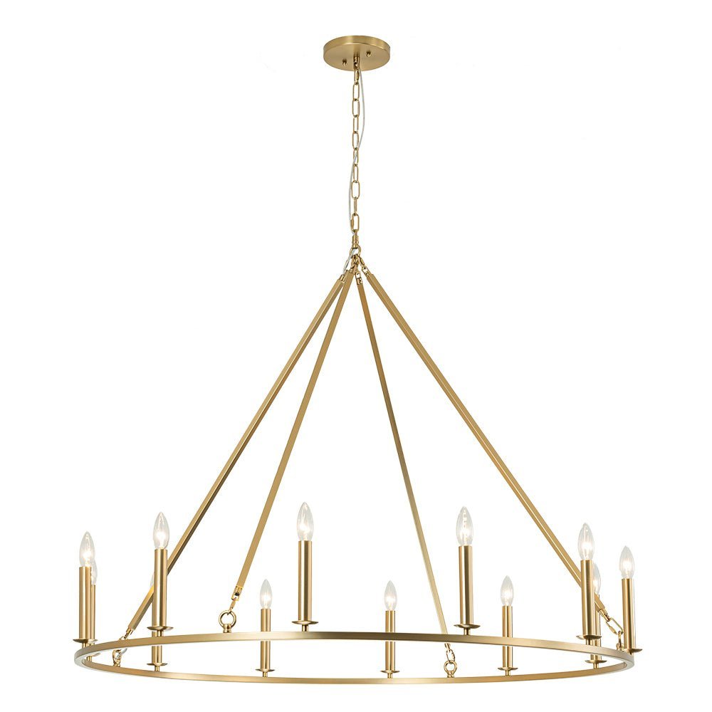 Twelve Lights • Candle Style • Wide Ring Design • Brushed Brass • E12 Candelabra Bulbs (Not Included) • Hardwired • UL Listed