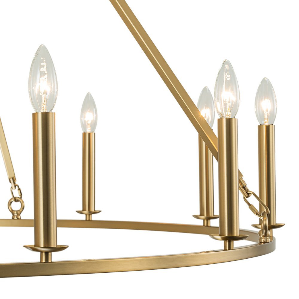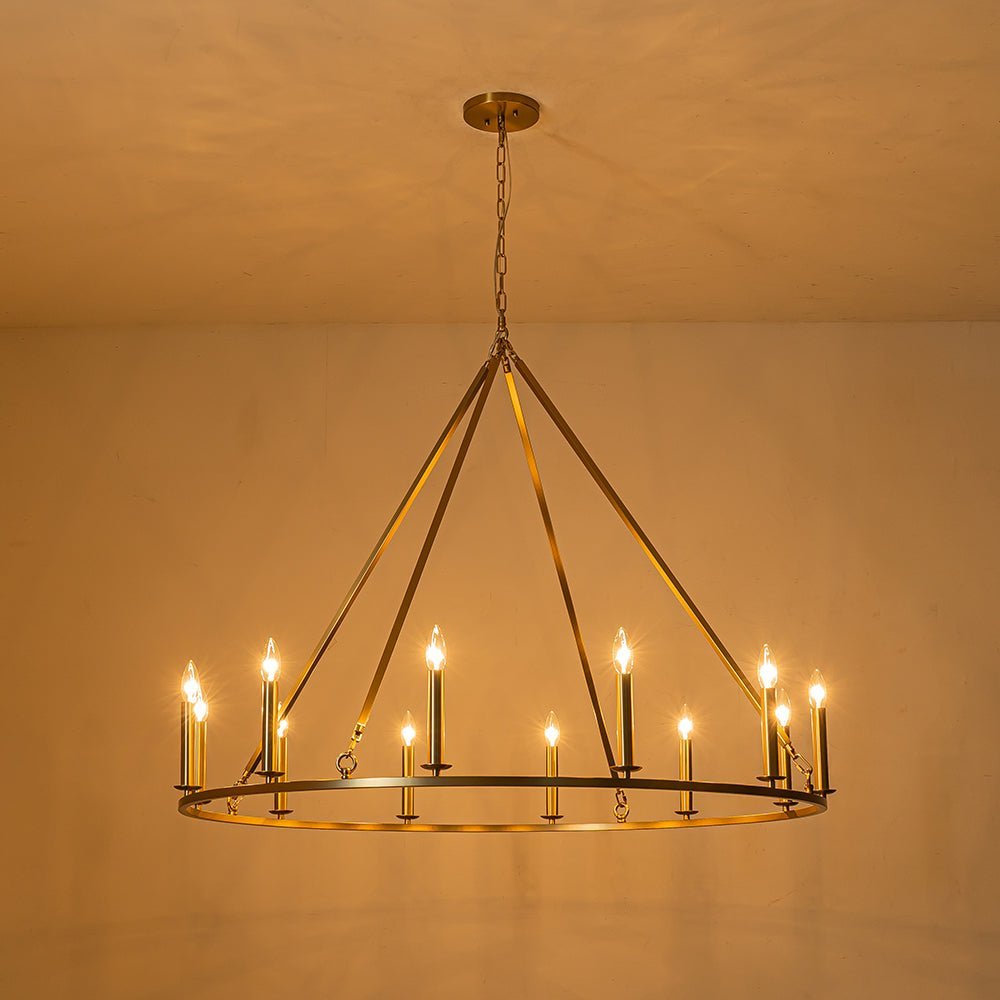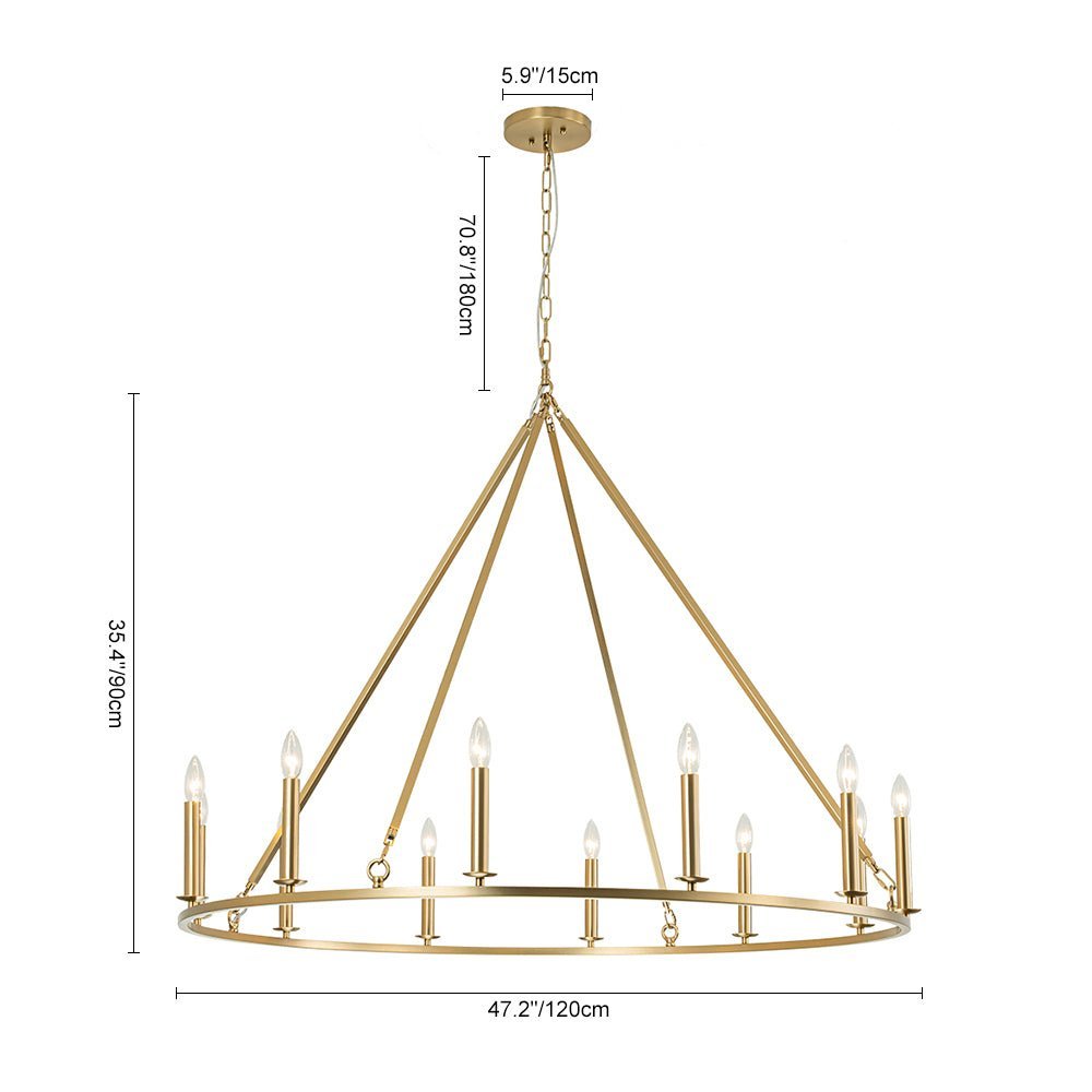 Crafted of durable iron in brushed brass finish. this simple circular pendant light features a wide. sleek ring frame. Accommodated with E12 candelabra bulbs (excluded). the candle style sockets perch on the slim ring to complement a traditional look of the wagon wheel chandelier. Chic classic and modern farmhouse. this oversized candle style wagon wheel chandelier lends a great result to enhance a living room. dining room. entry. lobby. kitchen island. bedroom. hall. or those large spaces that demand a strong statement.