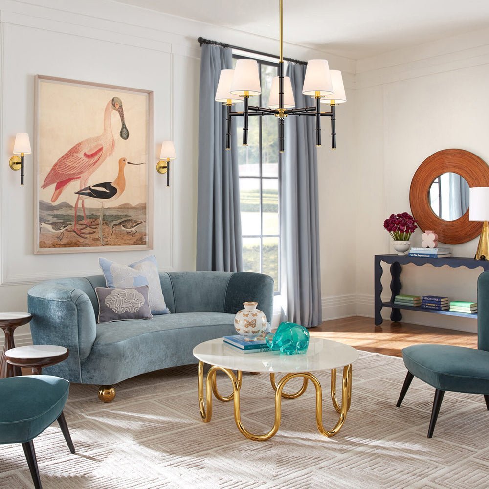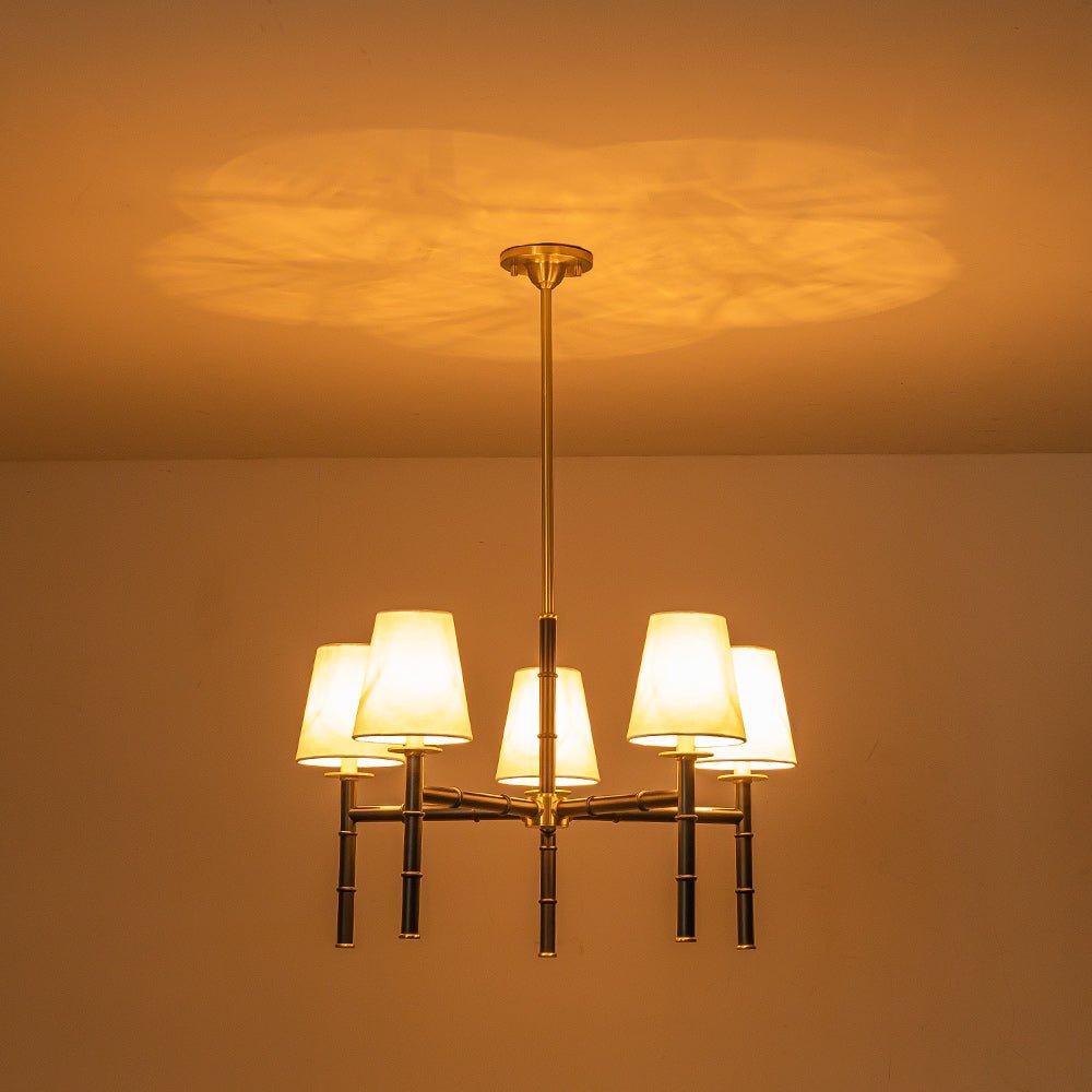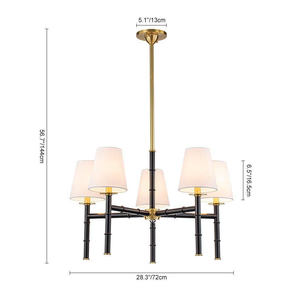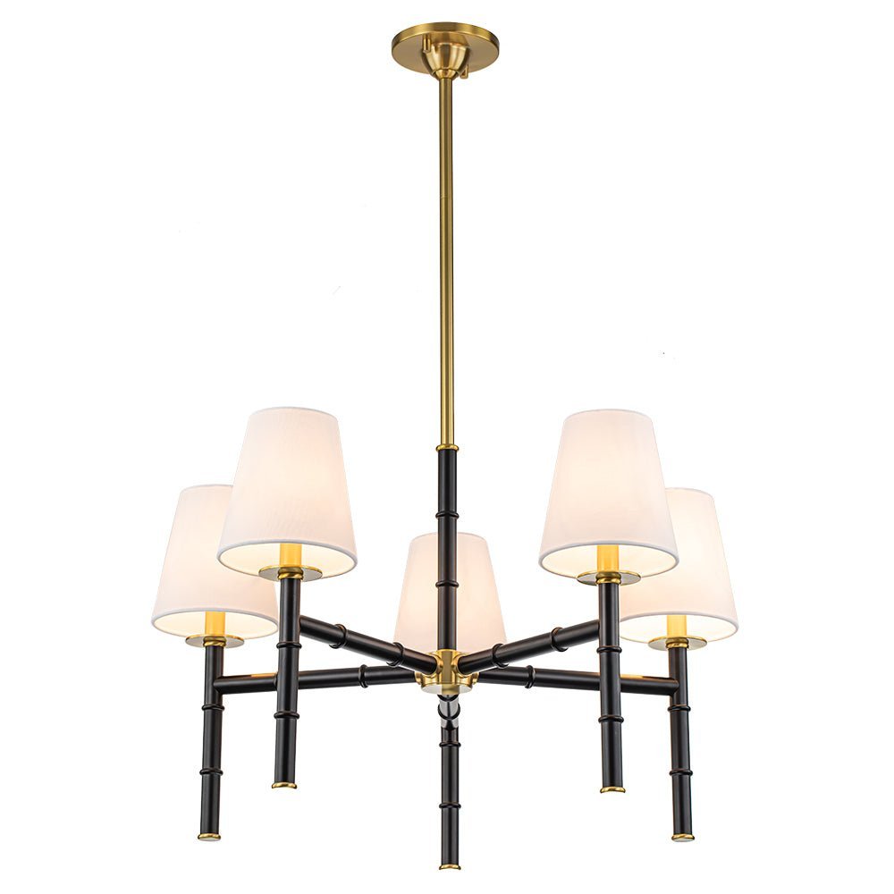A refined take on the classic French-style lighting. this 5-light chandelier is delicate with a hint of understated opulence. Finished in matte black. the sleek linear light arms with bamboo-style design deliver a vintage handsome texture and geometric beauty. The inviting brass hanging pole and details add a touch of mid-century modern style. Five cone white linen shades create a bright yet comfortable glow. Add a chic glamorous addition to your dining room. living room. kitchen island. bedroom. or entryway with this 5-light white linen shade chandelier.