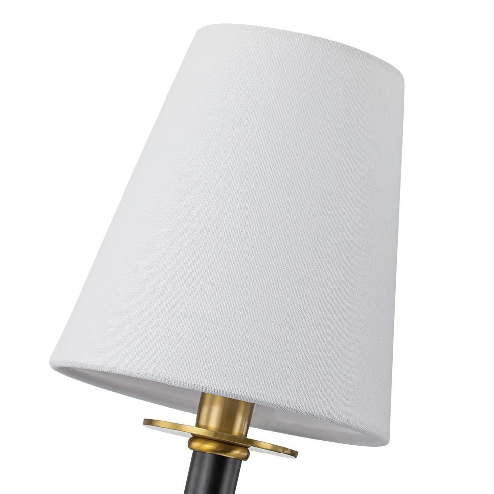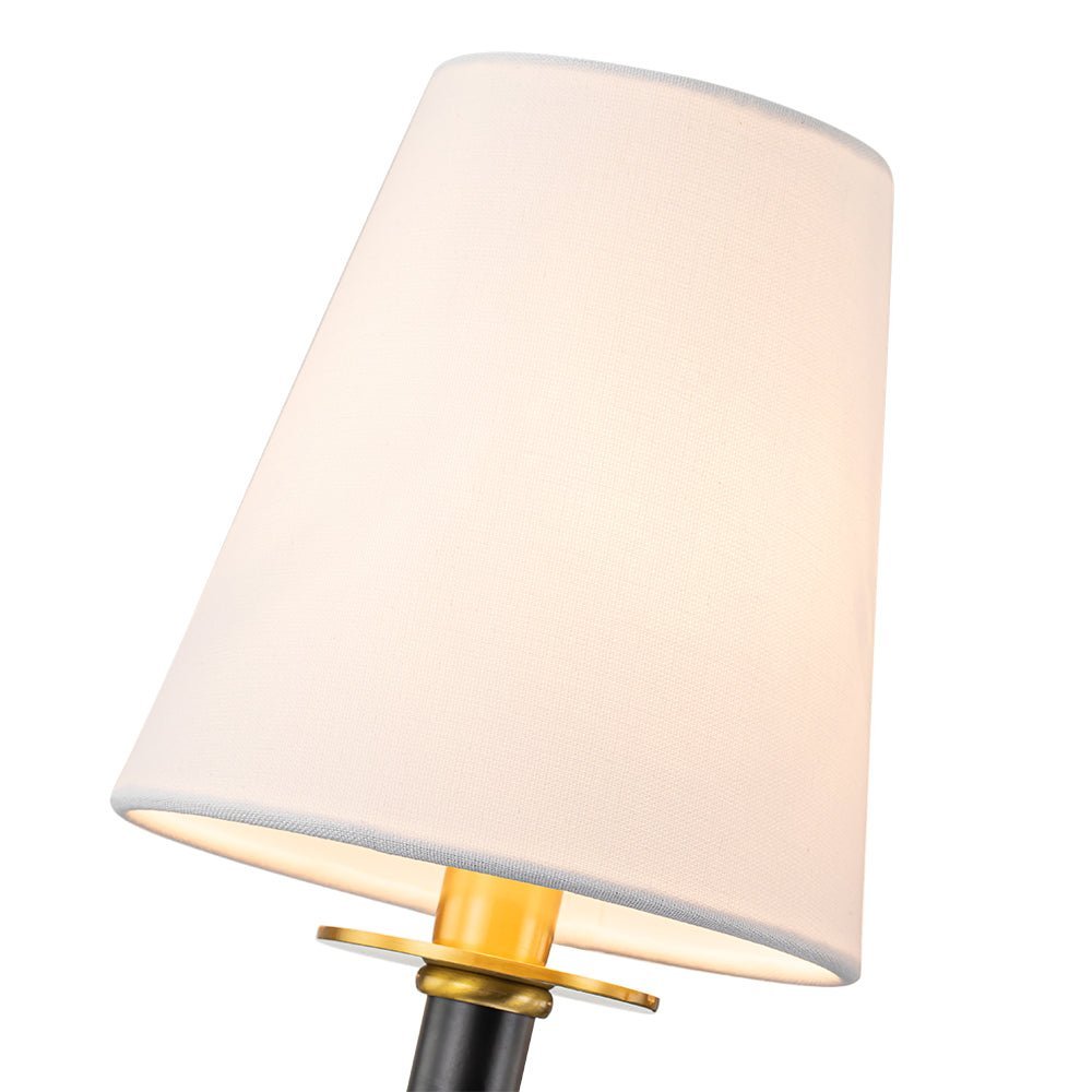 Five Lights • Cone Shades • White Linen • Modern Mid-century • Black + Brass Finish • E12 Bulbs (Not Included) • Hardwired • UL Listed