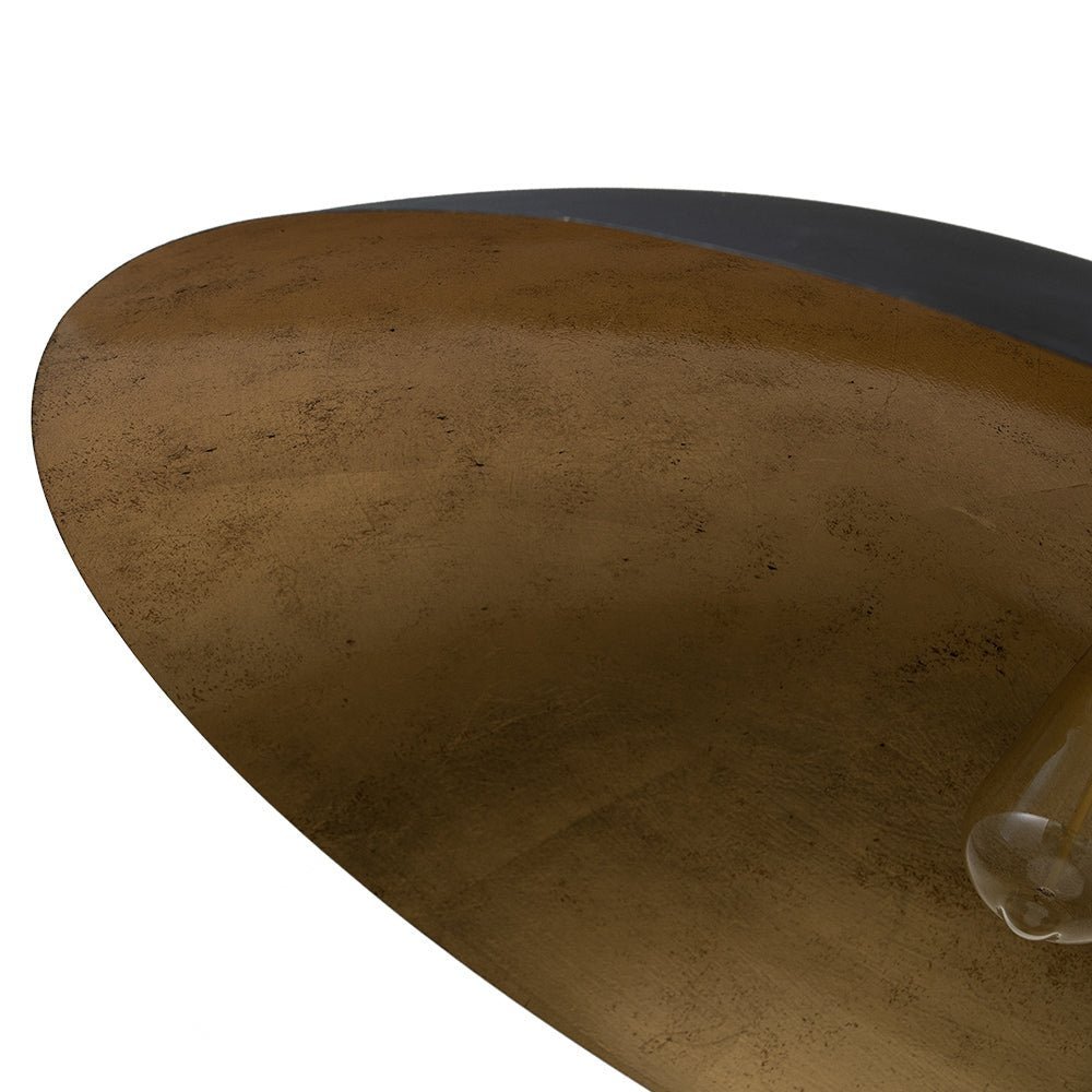 Incorporate a timelessly refined vintage aesthetics into your living space with our minimalist metallic pendant lamp. Boasting a sleek and wide. flattened dome shape. this pendant draws inspiration from a classic saucer design. showing an oversized outlook with a sprightly vibe. Hand-crafted with a luxurious golden foil interior. this piece effortlessly embodies rustic charm with a hint of industrial-style sand black on the exterior. Compatible with one E26-base bulb (not included). it provides an efficient task lighting downward. ideal for illuminating a dining table. kitchen island. living room. or entryway.